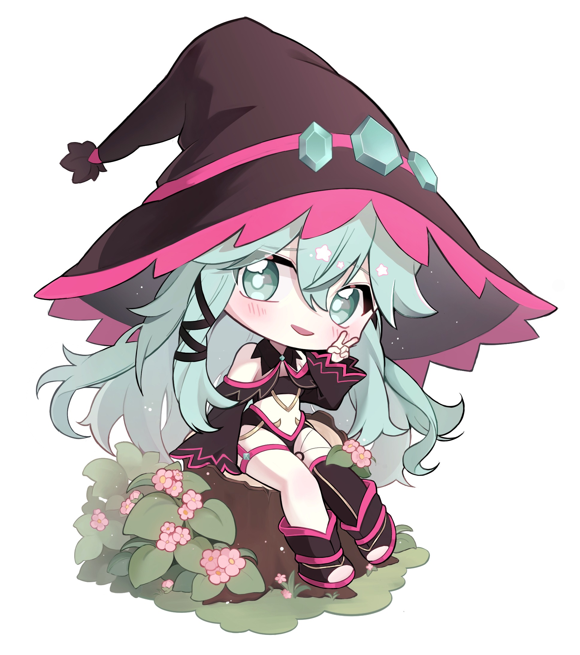 1girl alternate_costume artist_request asymmetrical_legwear bare_shoulders blush chibi date_a_live flower garter_straps gem green_eyes green_gem green_hair hair_between_eyes hat highres kyouno_natsumi long_hair long_sleeves looking_at_viewer open_mouth revealing_clothes second-party_source sitting solo v wide_sleeves witch_hat