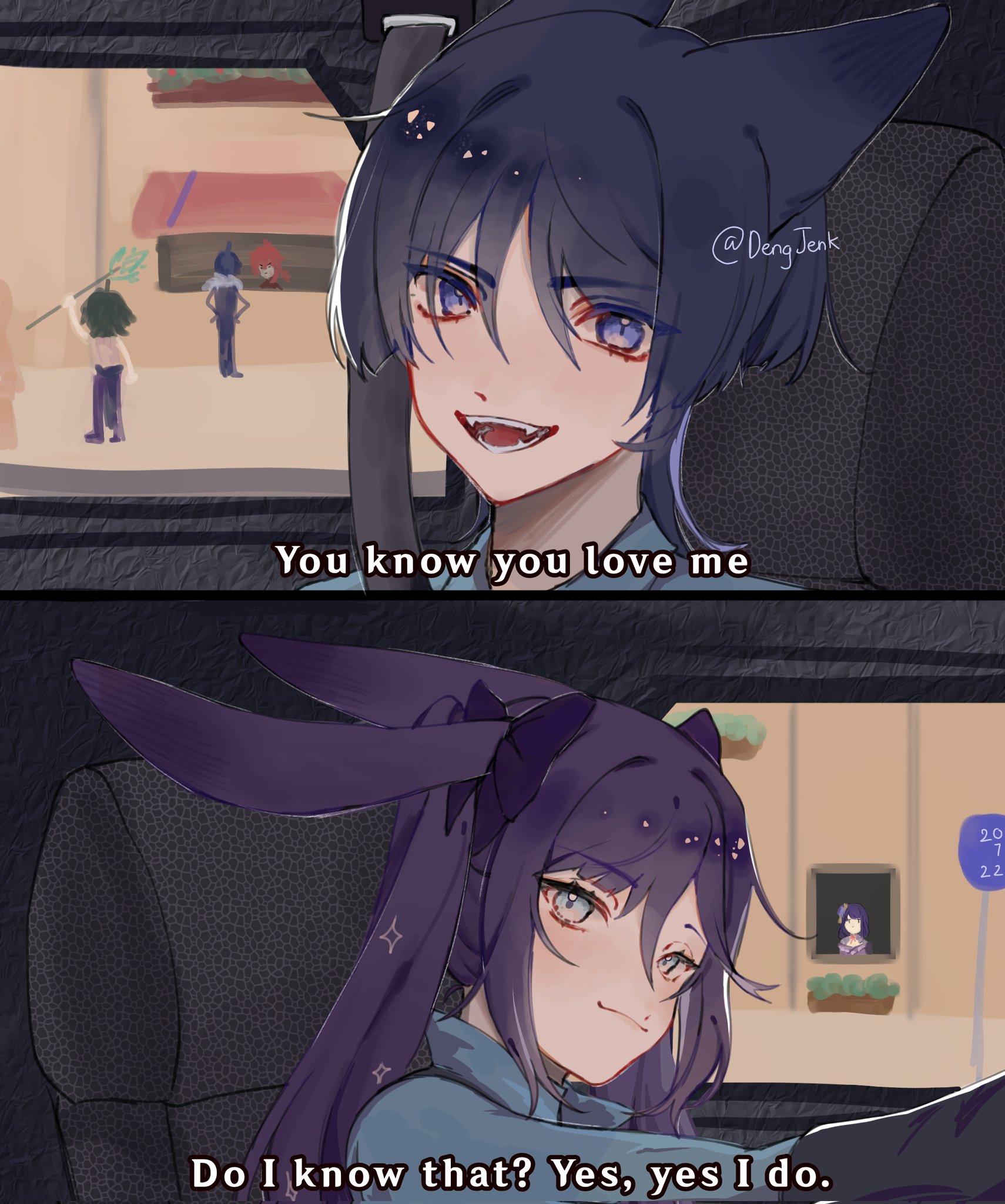 2girls 4boys ahoge alternate_costume animal_ears arm_at_side arm_up black_hair blue_hair blue_shirt blue_sleeves blunt_bangs blunt_ends bow brothers car closed_mouth collared_shirt contemporary cosplay couple dengjenk diluc_(genshin_impact) eyeliner eyeshadow fox_boy fox_ears fur_collar genshin_impact green_hair grey_eyes grey_shirt hair_between_eyes hair_bow hands_on_own_hips hetero highres holding holding_polearm holding_weapon judy_hopps judy_hopps_(cosplay) kaeya_(genshin_impact) long_hair looking_at_viewer makeup mona_(genshin_impact) motor_vehicle multiple_boys multiple_girls nick_wilde nick_wilde_(cosplay) on_car open_mouth pants parody polearm police police_uniform policewoman primordial_jade_winged-spear_(genshin_impact) purple_eyes purple_hair purple_pants rabbit_ears rabbit_girl raiden_shogun red_eyeliner red_eyeshadow red_hair scaramouche_(genshin_impact) scene_reference seatbelt sharp_teeth shirt siblings smile step-siblings subtitled teeth three-quarter_sleeves tsurime twintails twitter_username weapon window xiao_(genshin_impact) zootopia
