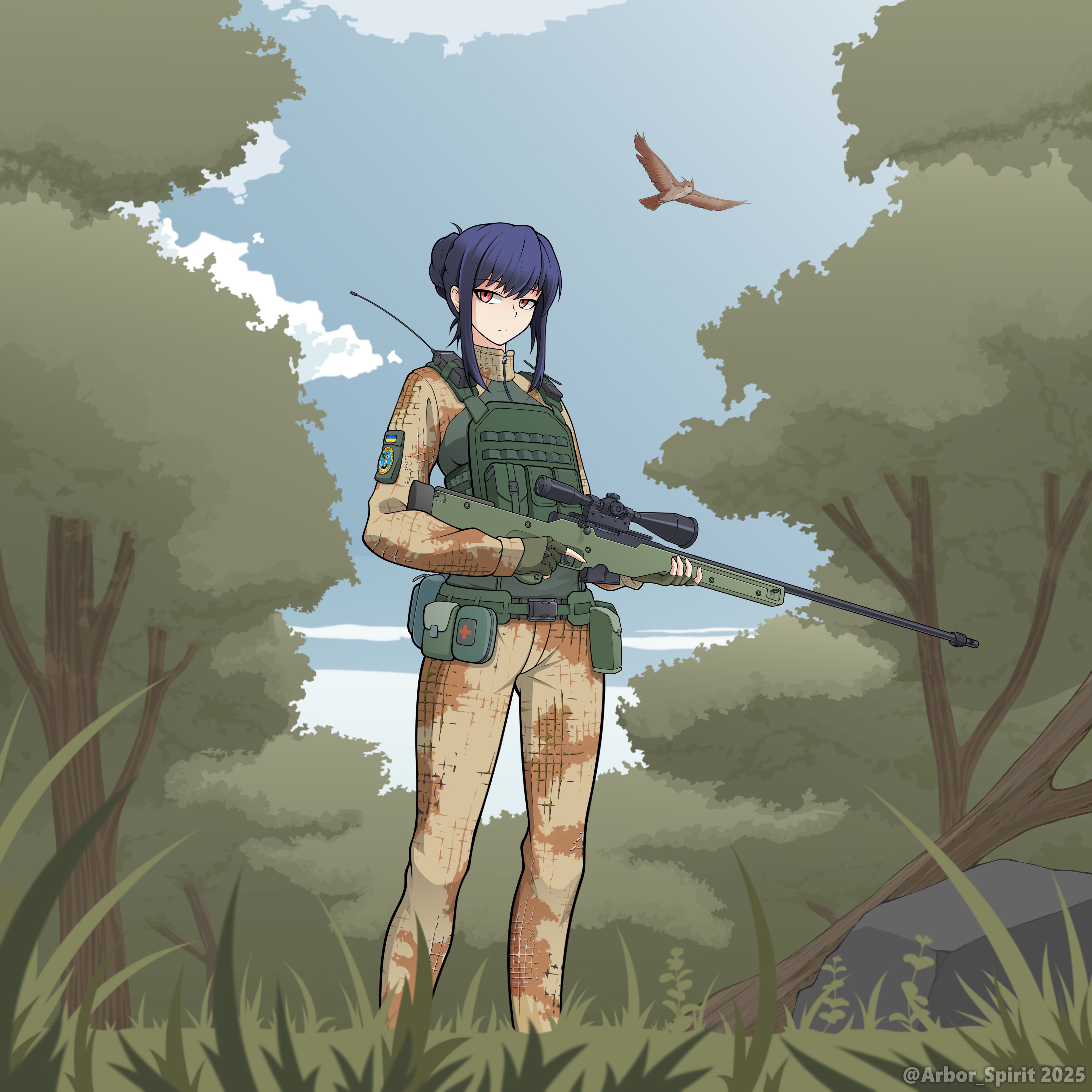 1girl absurdres accuracy_international ai_arctic_warfare ammunition_pouch animal arbor_spirit belt_pouch bird bolt_action bulletproof_vest camouflage camouflage_jacket camouflage_pants directorate_of_intelligence_(ukraine) eva_(kavunyak) expressionless flying forest gloves gun hair_bun highres holding jacket long_sleeves military military_combat_uniform military_uniform nature original owl pants pet pouch rifle russo-ukrainian_war scope short_hair sniper_rifle soldier ukraine ukrainian_flag walkie-talkie weapon