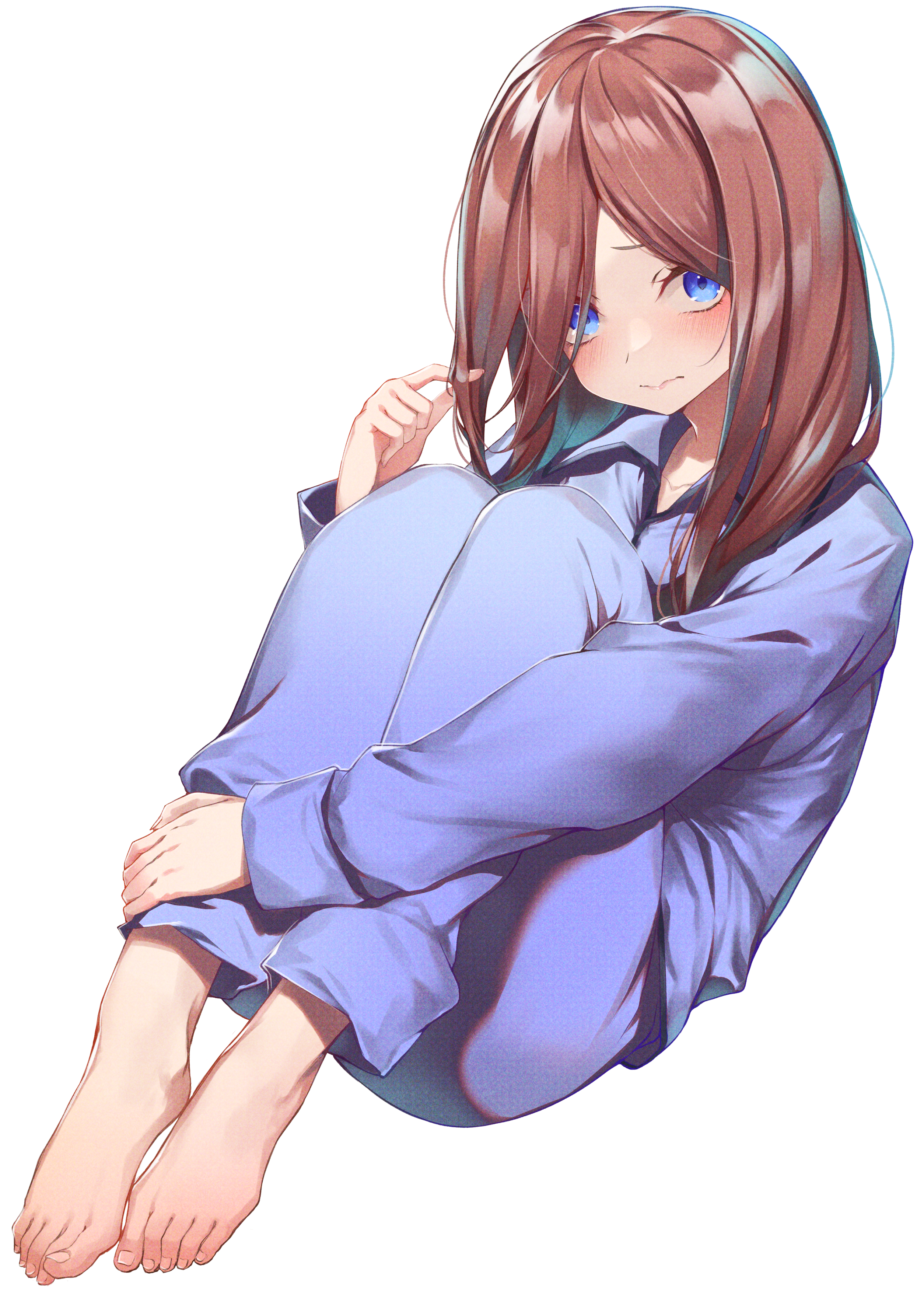 1girl absurdres barefoot blue_eyes blue_pajamas blue_pants blue_shirt blush brown_hair closed_mouth commentary_request full_body go-toubun_no_hanayome hachiroku_(hatirokusann86) highres hugging_own_legs long_hair long_sleeves nakano_miku pajamas pants playing_with_own_hair shirt simple_background solo toes white_background