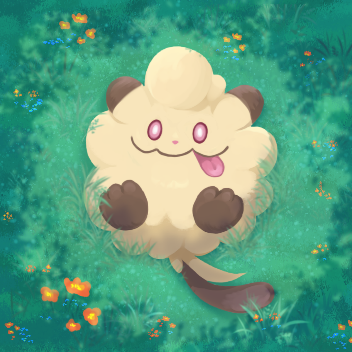 alternate_color bright_pupils closed_mouth commentary_request day flower from_above gen_6_pokemon grass happy highres lying midori_machiko nintendo no_humans on_back orange_flower outdoors pink_eyes pokemon pokemon_(creature) pokemon_focus shiny_pokemon smile solo swirlix tongue tongue_out white_pupils