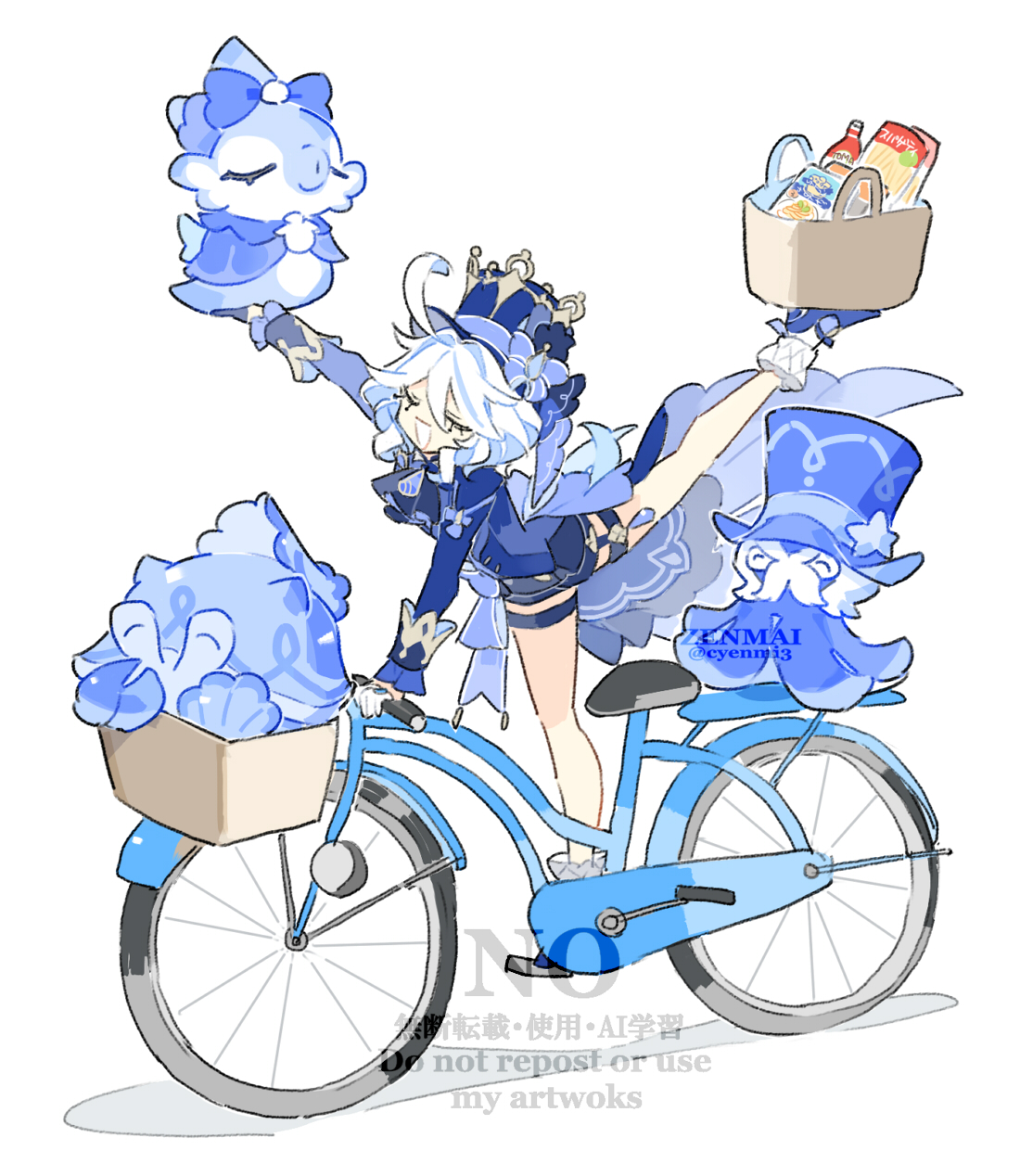 1girl :d ahoge ascot asymmetrical_gloves bag balancing bicycle black_gloves blue_ascot blue_jacket blue_shoes brooch closed_eyes commentary_request foot_up full_body furina_(genshin_impact) genshin_impact gentilhomme_usher gloves groceries grocery_bag hat highres jacket jewelry mademoiselle_crabaletta mismatched_gloves multicolored_hair open_mouth riding riding_bicycle shoes shopping_bag shorts simple_background smile solo streaked_hair surintendante_chevalmarin top_hat twitter_username white_background white_gloves white_hair zenmai_(cyenmi3)