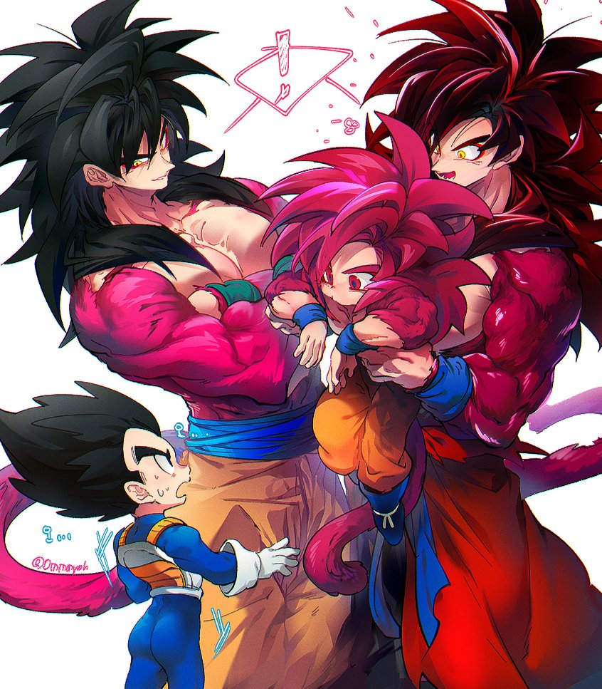 black_hair blue_sash closed_mouth dougi dragon_ball dragon_ball_daima dragon_ball_gt dragon_ball_heroes gloves long_hair male_focus monkey_boy monkey_tail multiple_boys muscular muscular_male ommmyoh open_mouth pants red_fur saiyan sash smile son_goku son_goku_(xeno) spiked_hair super_full_power_saiyan_4_limit_breaker super_saiyan super_saiyan_4 tail time_patrol_(dragon_ball) twitter_username vegeta wristband yellow_pants