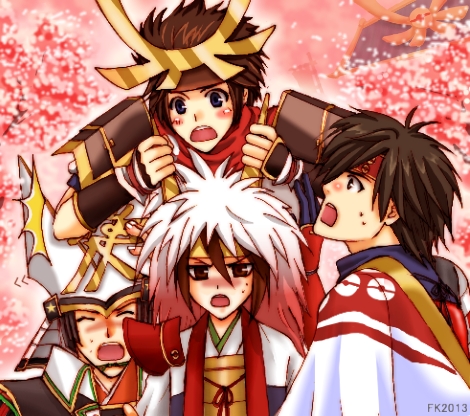 armor blue_eyes blush brown_eyes brown_hair castle cherry_blossoms fake_horns headband headdress helmet hero_(pokemon_conquest) horn_grab horned_headwear horns ishida_mitsunari_(sengoku_musou) japanese_clothes naoe_kanetsugu_(sengoku_musou) nintendo open_mouth poke_ball_print pokemon pokemon_conquest sanada_yukimura_(sengoku_musou) sengoku_musou