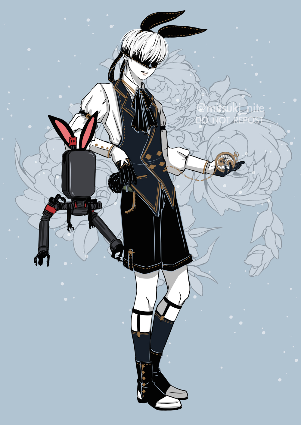 1boy 9s_(nier:automata) animal_ears ascot black_ascot black_shorts blindfold blue_background colored_skin commentary english_commentary fake_animal_ears floating floral_background highres holding holding_pocket_watch male_focus mitsuki_nite nier:automata nier_(series) non-humanoid_robot pocket_watch pod_(nier:automata) rabbit_ears robot short_hair shorts smile solo standing watch white_hair white_skin
