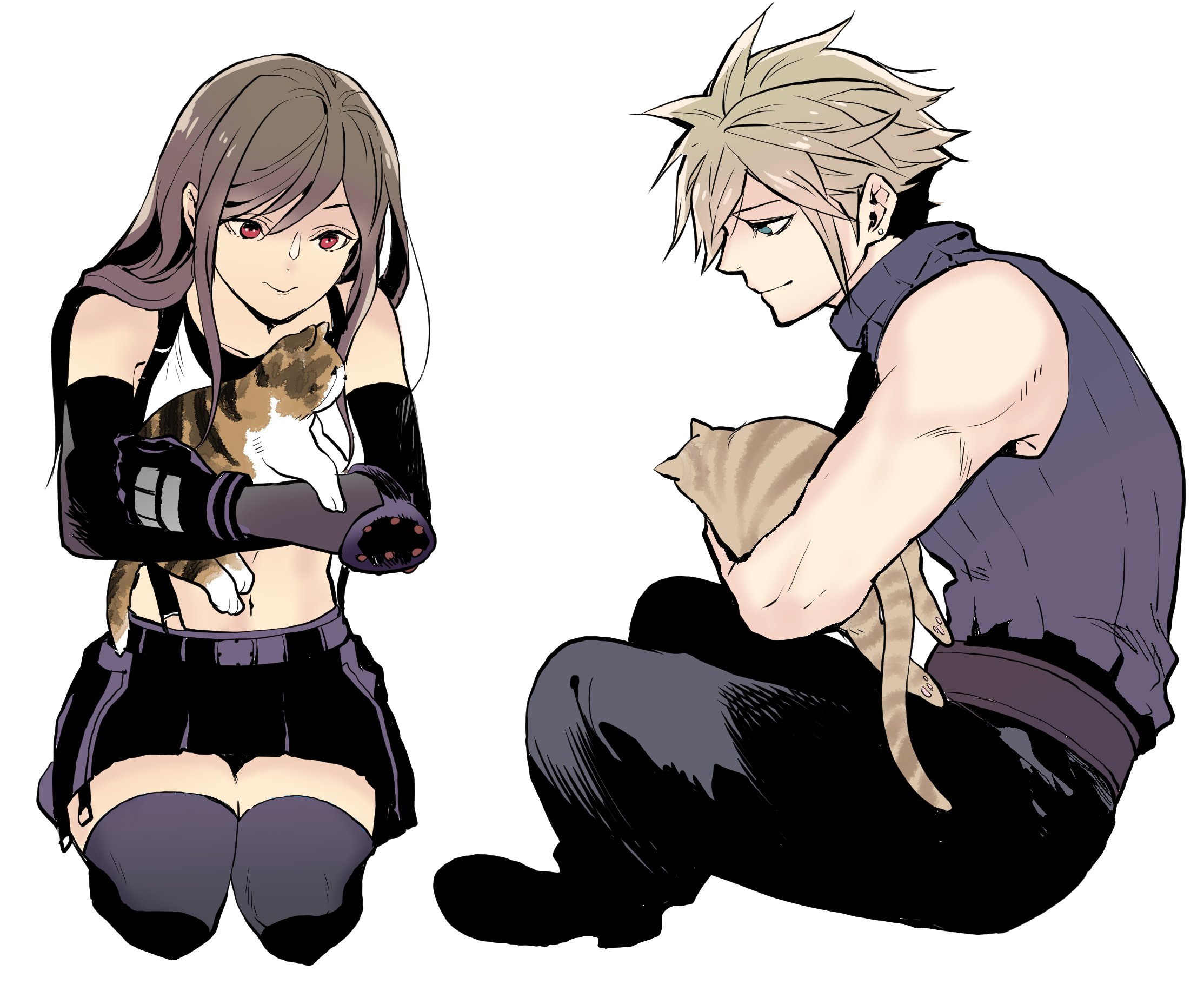 1boy 1girl animal animal_hug bare_arms bare_shoulders black_gloves black_pants black_skirt black_thighhighs blonde_hair blue_eyes blue_sweater brown_hair cat closed_mouth cloud_strife crop_top elbow_gloves final_fantasy final_fantasy_vii final_fantasy_vii_remake from_side full_body gloves highres holding holding_animal holding_cat kneeling long_hair midriff miniskirt mono0805 navel pants profile red_eyes ribbed_sweater short_hair sitting skirt sleeveless sleeveless_turtleneck smile spiked_hair suspender_skirt suspenders sweater tank_top thighhighs tifa_lockhart turtleneck turtleneck_sweater white_background white_tank_top zettai_ryouiki