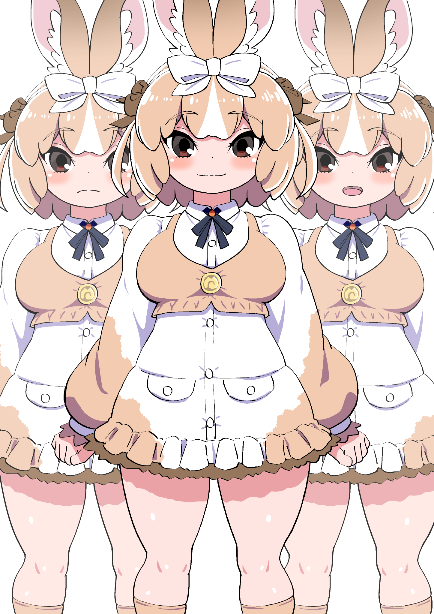 3girls animal_ears black_bow black_bowtie bow bowtie brown_dress brown_eyes brown_fur brown_hair brown_shirt brown_socks collared_dress cowboy_shot domestic_rabbit_(kemono_friends) dress frilled_dress frills frown fur_trim hair_between_eyes hair_bow highres japari_symbol kemono_friends long_sleeves looking_at_viewer mamiyama multicolored_hair multiple_girls open_mouth puffy_sleeves rabbit_ears rabbit_girl rabbit_tail shirt short_twintails sidelocks smile socks tail twintails two-tone_dress two-tone_hair white_bow white_dress white_hair