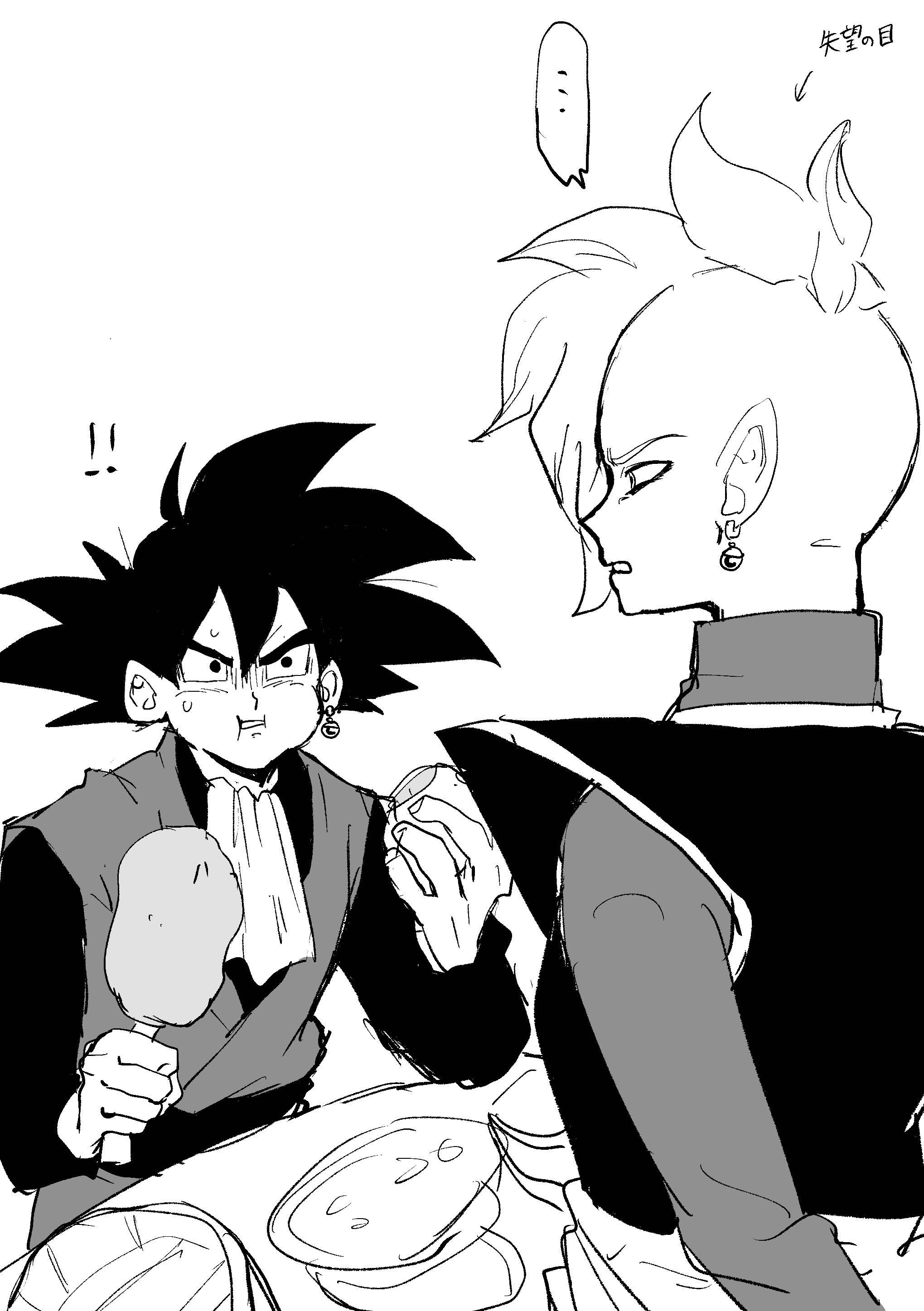 2boys absurdres arms_behind_back bad_source black_bodysuit black_hair bodysuit disappointed dougi dragon_ball dragon_ball_super earrings eating eye_contact food goku_black greyscale hageta1456 highres holding holding_food japanese_text jewelry long_sleeves looking_at_another mohawk monochrome multiple_boys pointy_ears potara_earrings saiyan sash shirt short_hair sketch spiked_hair sweat white_hair zamasu