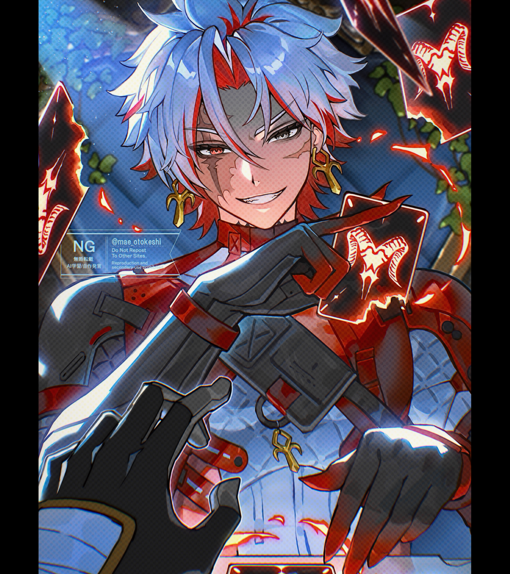 2boys artist_name bandaged_hand bandages black_gloves bodysuit burn_scar card commentary cross evil_grin evil_smile gloves gradient_gloves grey_eyes grin hair_between_eyes hand_up heterochromia highres holding holding_card looking_at_viewer male_focus male_rover_(wuthering_waves) multicolored_hair multiple_boys parted_bangs pillarboxed plant playing_card pov pov_hands red_eyes red_gloves red_hair rover_(wuthering_waves) scar scar_(wuthering_waves) scar_across_eye scar_on_face short_hair smile streaked_hair takahashi_suika teeth twitter_username two-tone_hair upper_body v-shaped_eyebrows vines watermark white_hair wuthering_waves