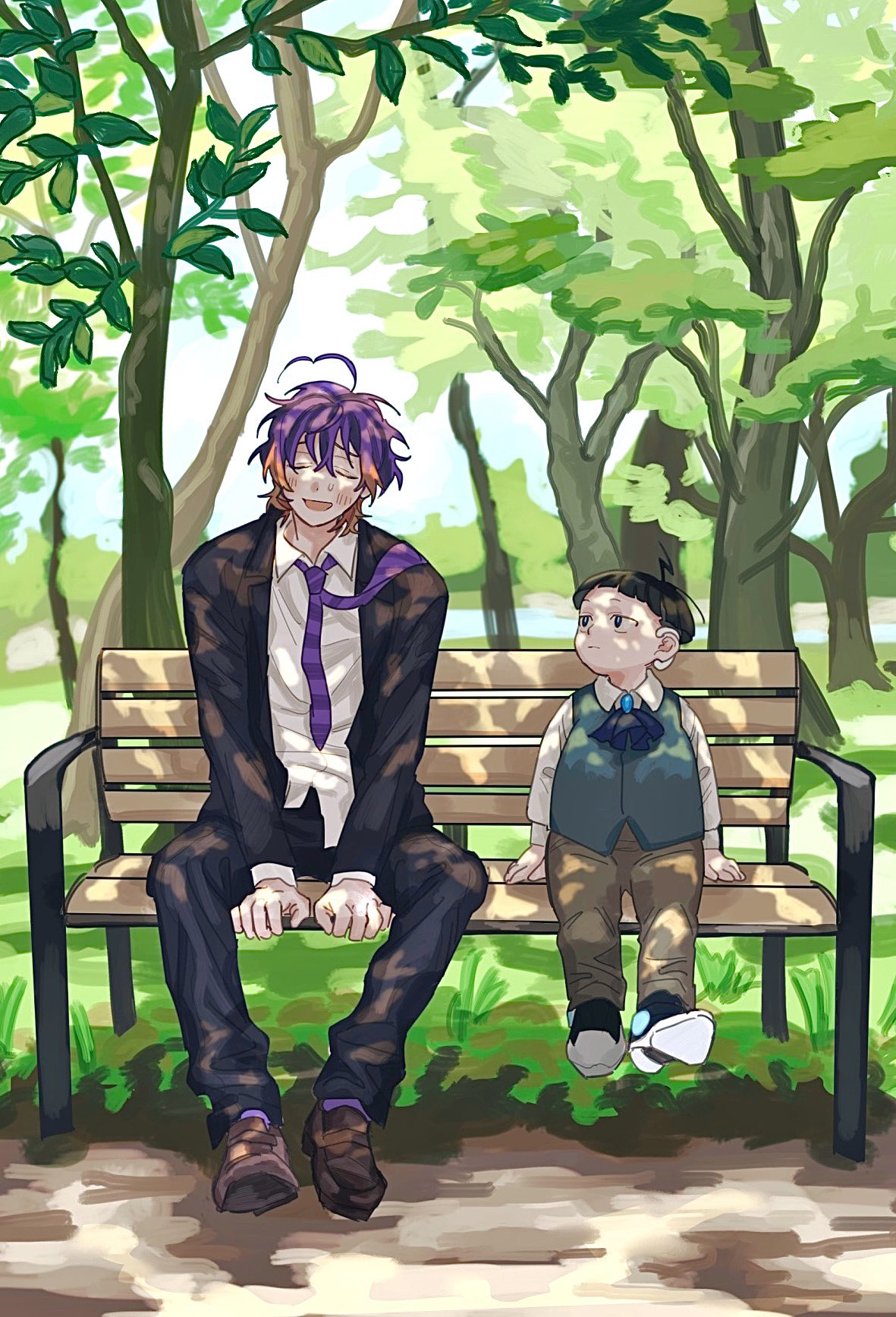 2boys aba_(yrsge) ahoge bench black_eyes black_jacket black_pants black_suit blue_vest blush bowl_cut brown_pants brown_shoes call_of_cthulhu closed_eyes closed_mouth collared_shirt colored_tips dappled_sunlight day facing_viewer formal_clothes fujimura_saki full_body grass highres jacket kaikou_(trpg_scenario) lightning_ahoge loafers looking_at_another looking_to_the_side male_focus multicolored_hair multiple_boys napoli_no_otokotachi necktie necktie_over_shoulder on_bench open_mouth orange_hair outdoors pants park park_bench purple_hair purple_necktie shikimitsu_(napoli_no_otokotachi) shirt shoes short_hair side-by-side sitting smile suit sunlight tree v_arms vest white_shirt