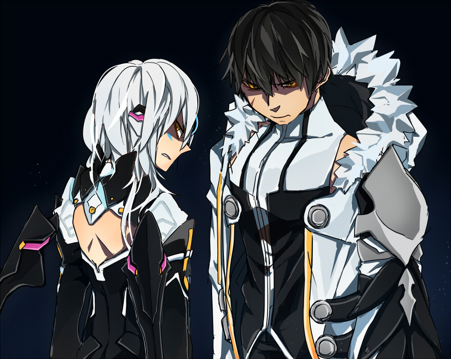 1boy 1girl android black_dress black_hair blade_master_(elsword) code:_nemesis_(elsword) dress elsword esu_(transc) eve_(elsword) facial_mark jacket looking_at_viewer looking_back mechanical_arms raven_cronwell robot_ears scar scowl shaded_face single_mechanical_arm white_hair yellow_eyes