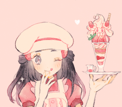 2girls alcremie alcremie_(strawberry_sweet) alcremie_(vanilla_cream) apron black_hair chef_hat dawn_(palentine's_2021)_(pokemon) dawn_(pokemon) dress food food-themed_hair_ornament fruit gen_8_pokemon grey_eyes hair_ornament hairclip hat heart holding holding_plate long_hair lowres multiple_girls nintendo official_alternate_costume one_eye_closed parfait pink_background pink_dress plate pokemon pokemon_masters_ex puffy_short_sleeves puffy_sleeves ryokuno_green short_sleeves strawberry strawberry_hair_ornament strawberry_parfait tongue white_apron white_hat
