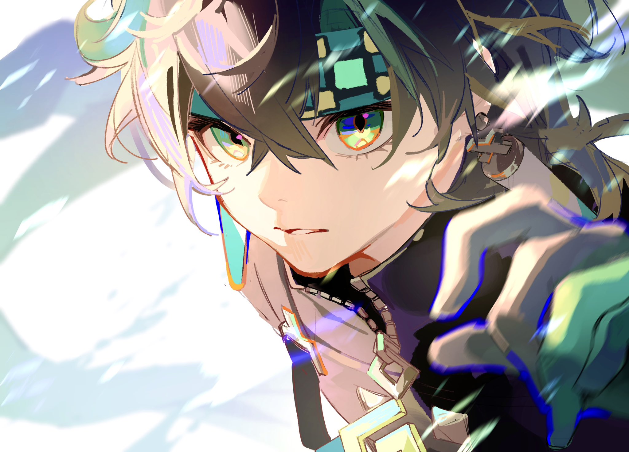 1boy aqua_gloves aqua_hair aqua_headband aura black_jacket brown_hair checkered_clothes checkered_headband collared_jacket commentary_request genshin_impact gloves headband high_collar highres jacket kinich_(genshin_impact) long_sleeves male_focus multicolored_hair oriori_0201 outstretched_hand solo streaked_hair upper_body white_background zipper zipper_pull_tab