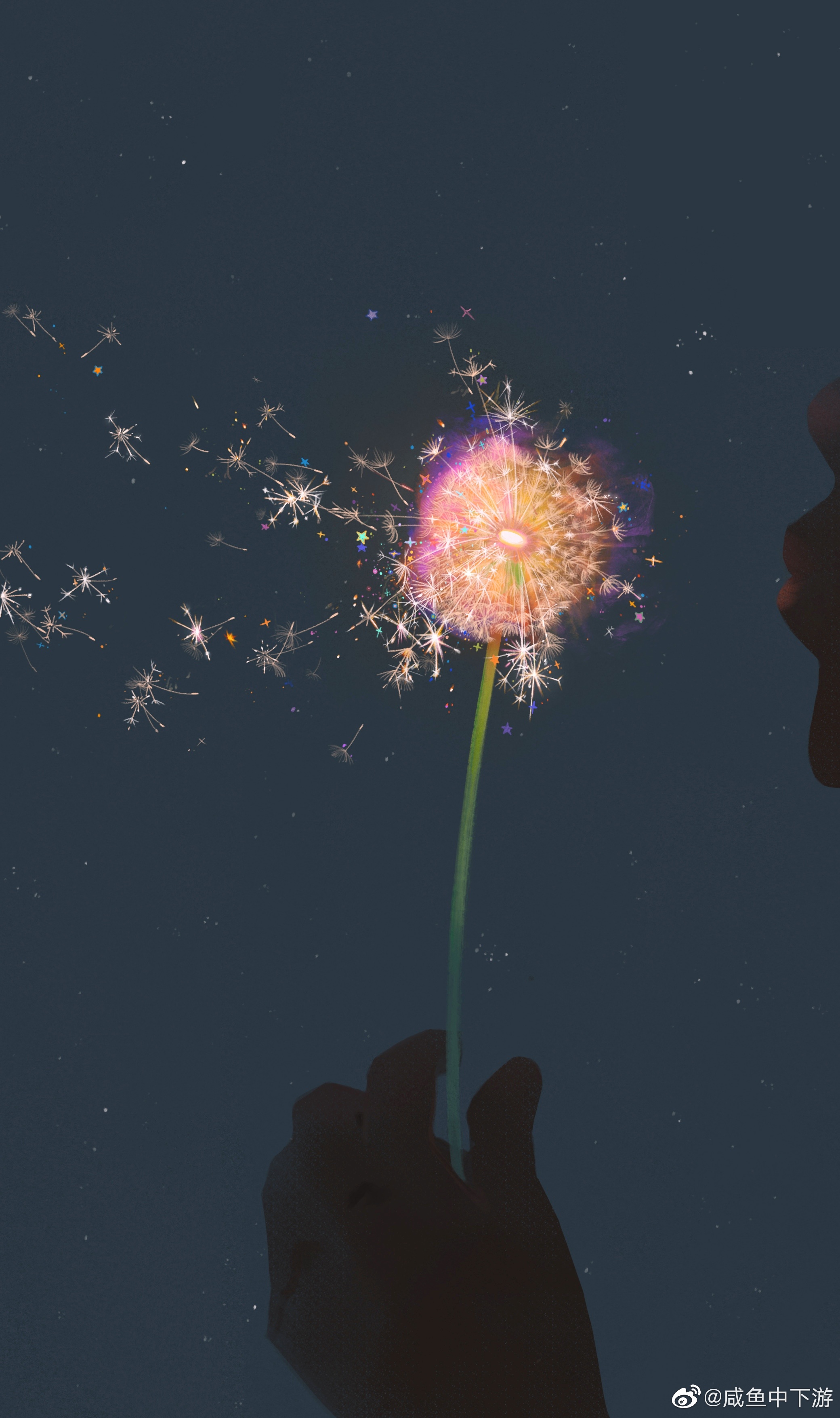 1other absurdres ambiguous_gender blowing chinese_commentary commentary_request dandelion flower highres holding holding_flower night object_focus original outdoors sky watermark weibo_watermark xianyu_zhong_xiayou