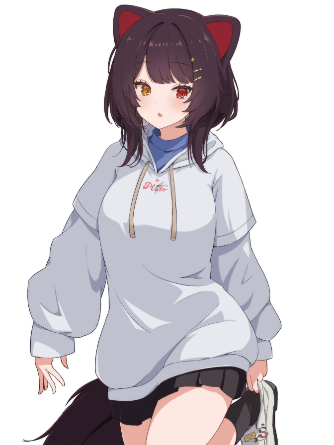 1girl :o adjusting_footwear animal_ears black_skirt black_socks blue_shirt blurry blush border breasts brown_hair clothes_writing commentary_request cowboy_shot depth_of_field dog_ears dog_girl dog_tail dot_nose eyelashes foot_up grey_hoodie hair_ornament hairpin hand_on_own_foot heterochromia hood hood_down hoodie inui_toko inui_toko_(hoodie) layered_sleeves long_sleeves looking_at_viewer medium_breasts medium_hair miniskirt multiple_hairpins nijisanji no_pupils open_mouth pleated_skirt red_eyes remiria100 sanbaka_(nijisanji) shirt shoes simple_background skirt socks solo standing star_(symbol) star_hair_ornament tail transparent_background virtual_youtuber white_border white_shoes yellow_eyes