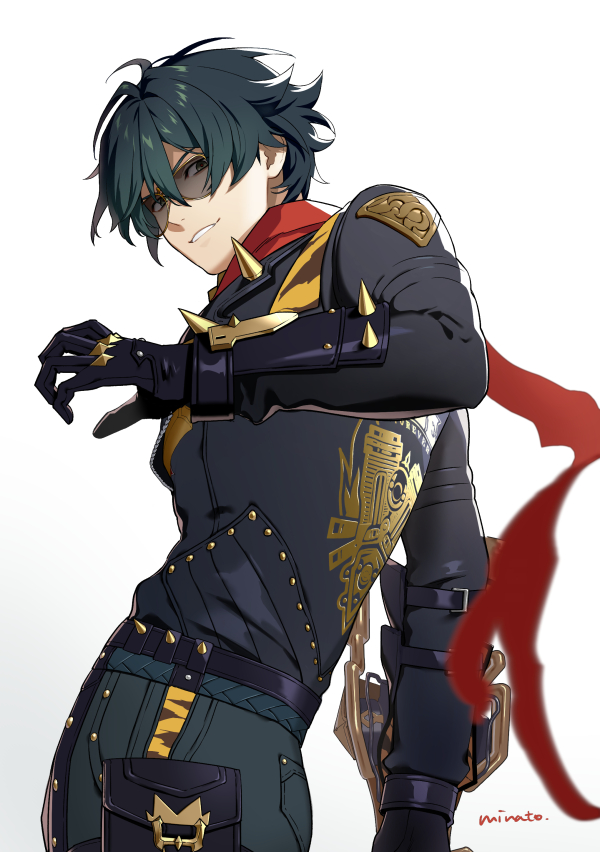 1boy black_gloves black_hair black_jacket blue_hair blue_pants commentary_request gloves grin hair_between_eyes jacket lighter_(zenless_zone_zero) long_sleeves looking_at_viewer male_focus minato_(robin) pants red_scarf scarf signature simple_background smile solo spiked_jacket sunglasses torn_clothes torn_scarf zenless_zone_zero