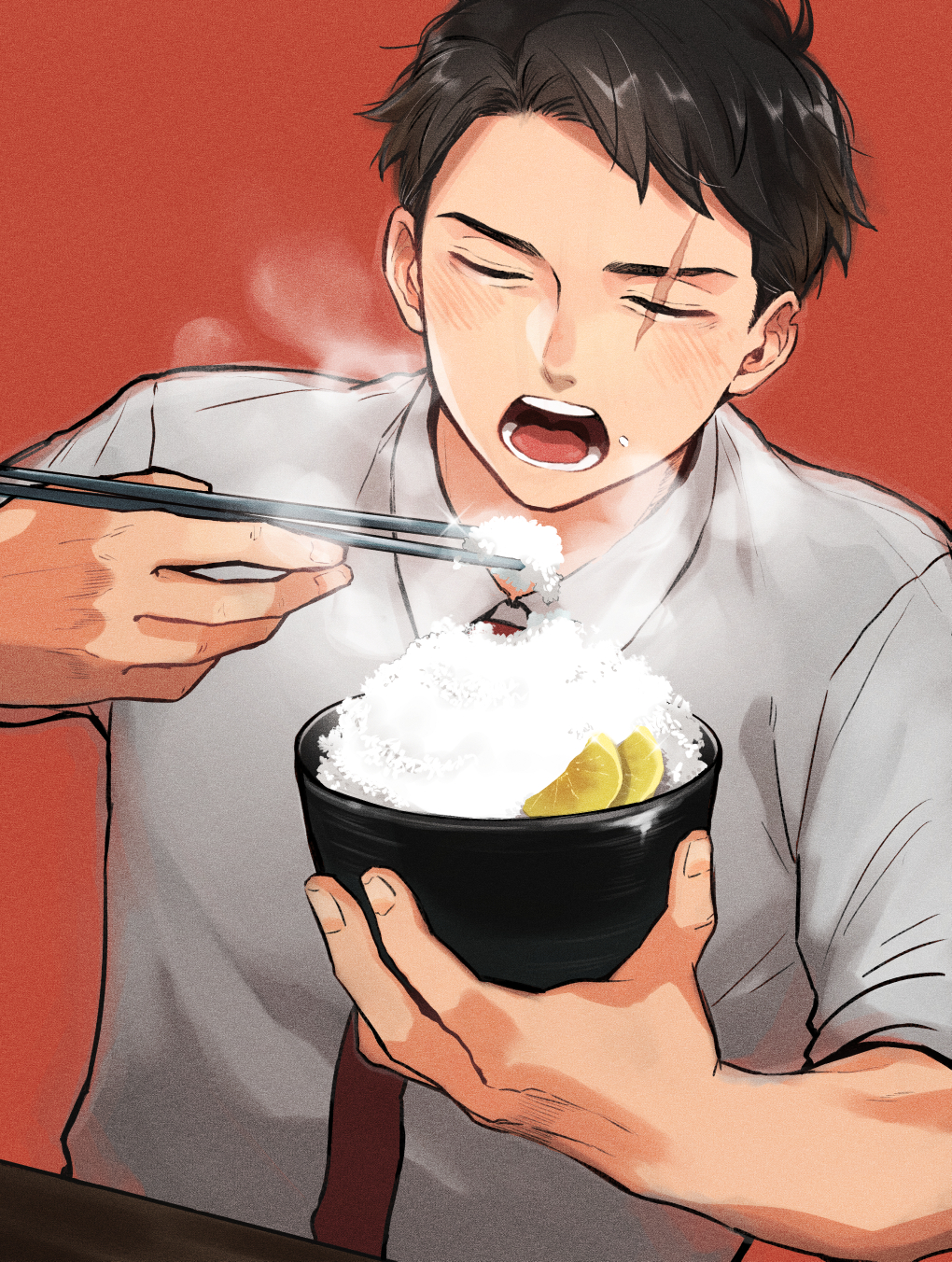 1boy black_hair bowl chopsticks closed_eyes eating fingernails food food_on_face fruit gegege_no_kitarou glint highres holding holding_bowl holding_chopsticks itokon300 kitarou_tanjou:_gegege_no_nazo lemon lemon_slice male_focus mizuki_(gegege_no_kitarou) necktie open_mouth red_background red_necktie rice scar scar_across_eye scar_on_face shirt short_hair simple_background solo steam teeth upper_body white_shirt