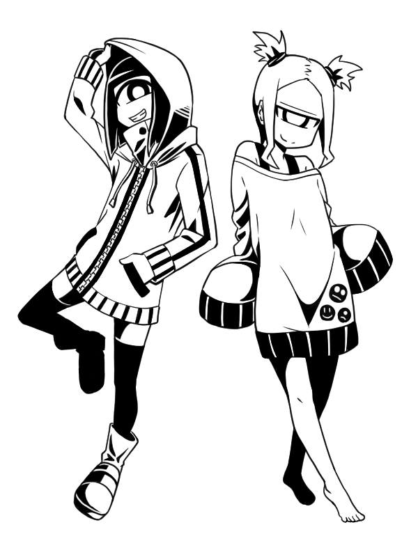 2girls adjusting_hood barefoot black_thighhighs cyclops hand_in_pocket hood hood_up jacket long_sleeves looking_at_viewer medium_hair monochrome monster_girl multiple_girls off-shoulder_shirt off_shoulder one-eyed original shirt short_twintails simple_background sleeves_past_fingers sleeves_past_wrists standing thighhighs twintails white_background yakochu zipper
