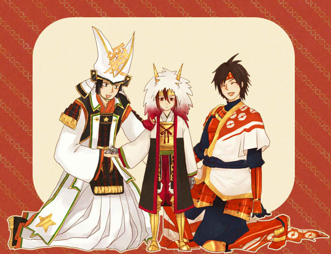 armor armored_boots black_hair boots brown_eyes brown_hair coat fake_horns hakama hakama_pants headband headdress helmet holding_hands horned_headwear horns ishida_mitsunari_(sengoku_musou) japanese_clothes kimono naoe_kanetsugu_(sengoku_musou) nintendo pants poke_ball_print pokemon pokemon_conquest sanada_yukimura_(sengoku_musou) sengoku_musou smile