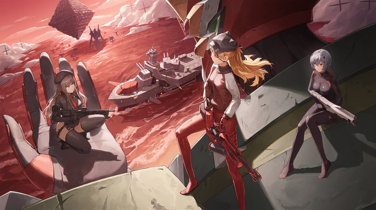 3girls admire_(nikke) angel_(evangelion) ayanami_rei beret black_bodysuit black_thighhighs blue_hair bodysuit breasts brown_hair cotta_(heleif) crossover cyborg eva_02 eyepatch floating floating_object giant giant_monster giant_robot goddess_of_victory:_nikke gun hat holding holding_gun holding_weapon kaiju long_hair mecha mecha_pilot_suit military_vehicle monster multiple_girls neon_genesis_evangelion ocean orange_hair outdoors ramiel_(evangelion) rapi_(nikke) red_bodysuit red_eyes red_sky red_water robot ship short_hair sky souryuu_asuka_langley thighhighs warship watercraft weapon