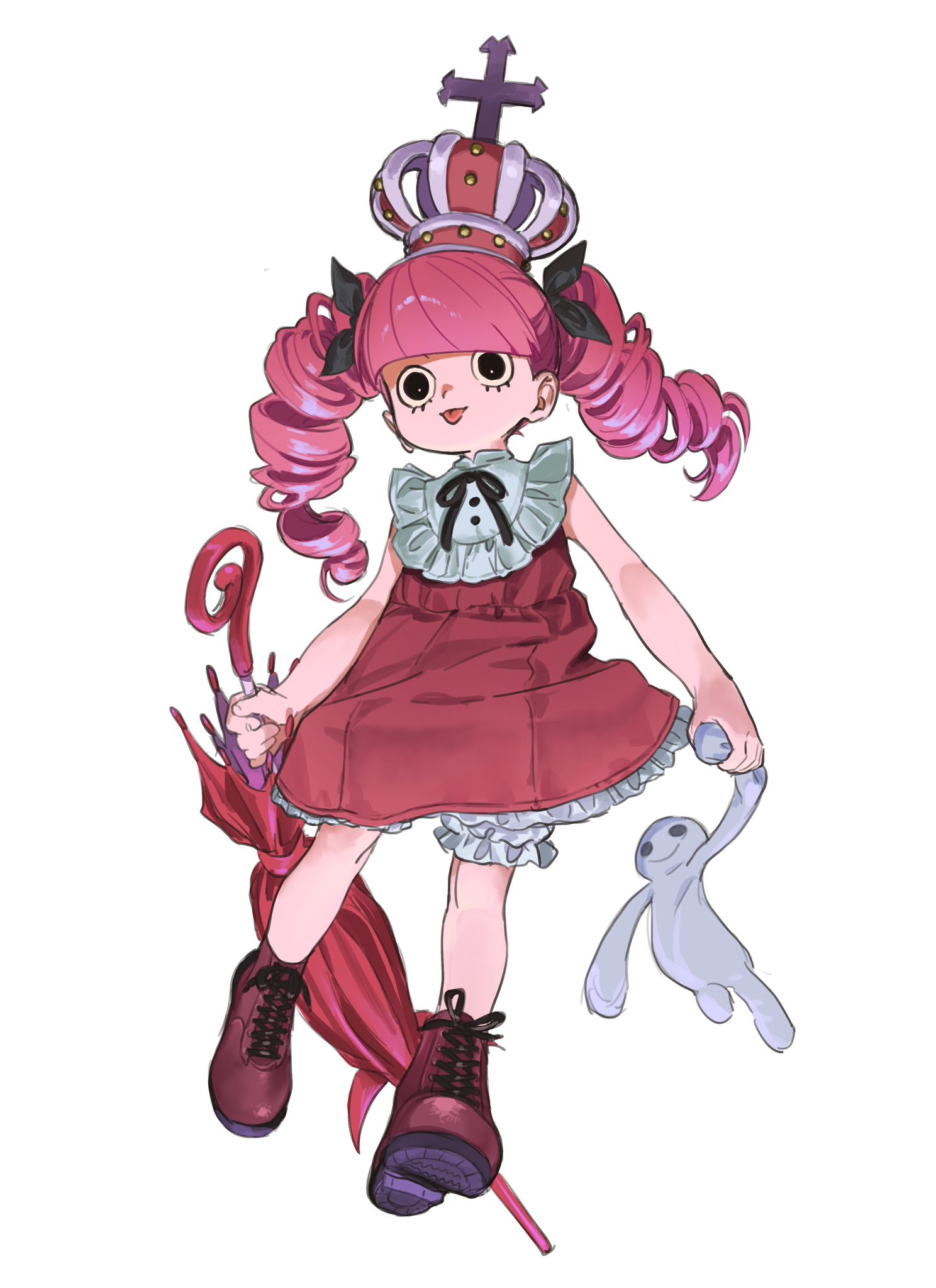 1girl aged_down black_eyes black_ribbon cross crown dress drill_hair full_body highres holding holding_stuffed_toy holding_umbrella long_hair lower_eyelashes_only mini_crown one_piece perona pink_hair red_dress red_umbrella ribbon solid_circle_pupils solo stuffed_toy tongue tongue_out twin_drills twintails umbrella urasanmyaku white_background