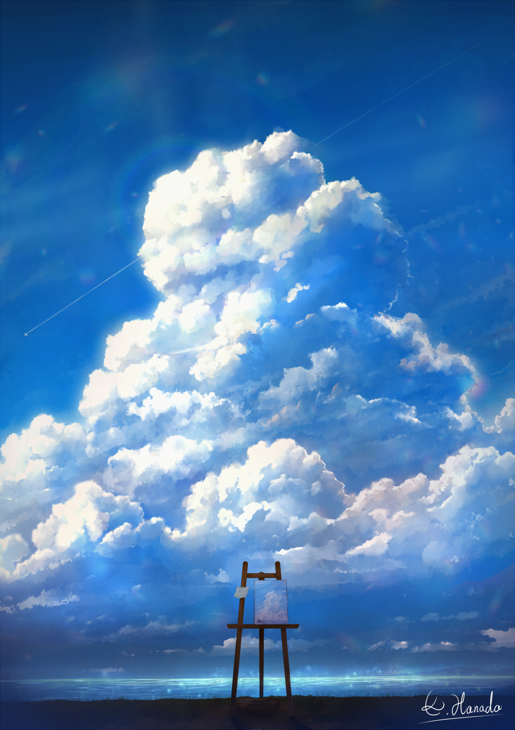 alu.m_(alpcmas) blue_sky canvas_(object) cloud cloudy_sky commentary_request cumulonimbus_cloud easel evening highres no_humans original outdoors scenery signature sky