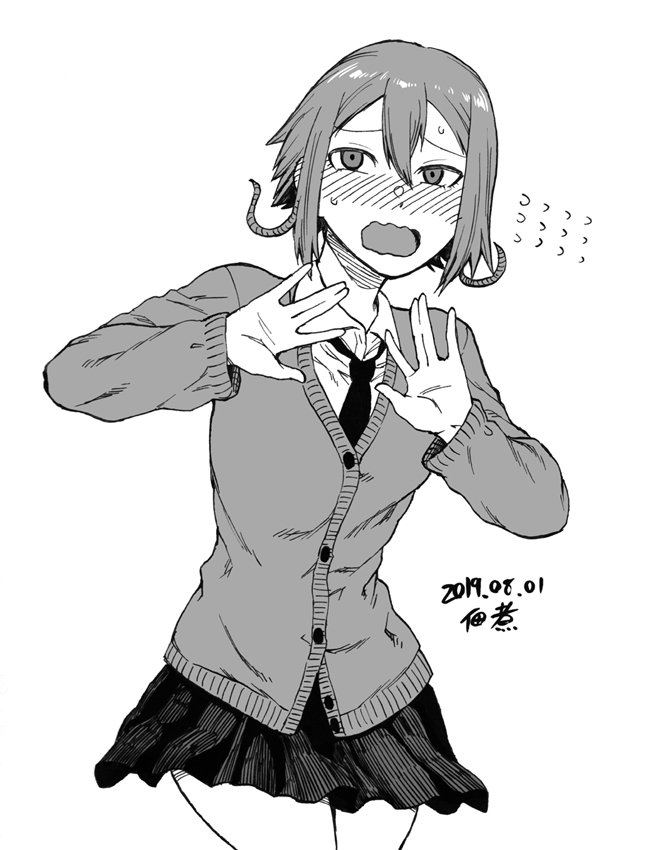 1girl arms_up black_necktie blush buttons collared_shirt commentary_request cowboy_shot dated embarrassed full-face_blush greyscale hair_between_eyes legs long_sidelocks long_sleeves looking_at_viewer monochrome necktie open_mouth original school_uniform shirt short_hair sidelocks signature simple_background skirt standing sweatdrop sweater thighs tsukudani_(coke-buta) white_background white_shirt
