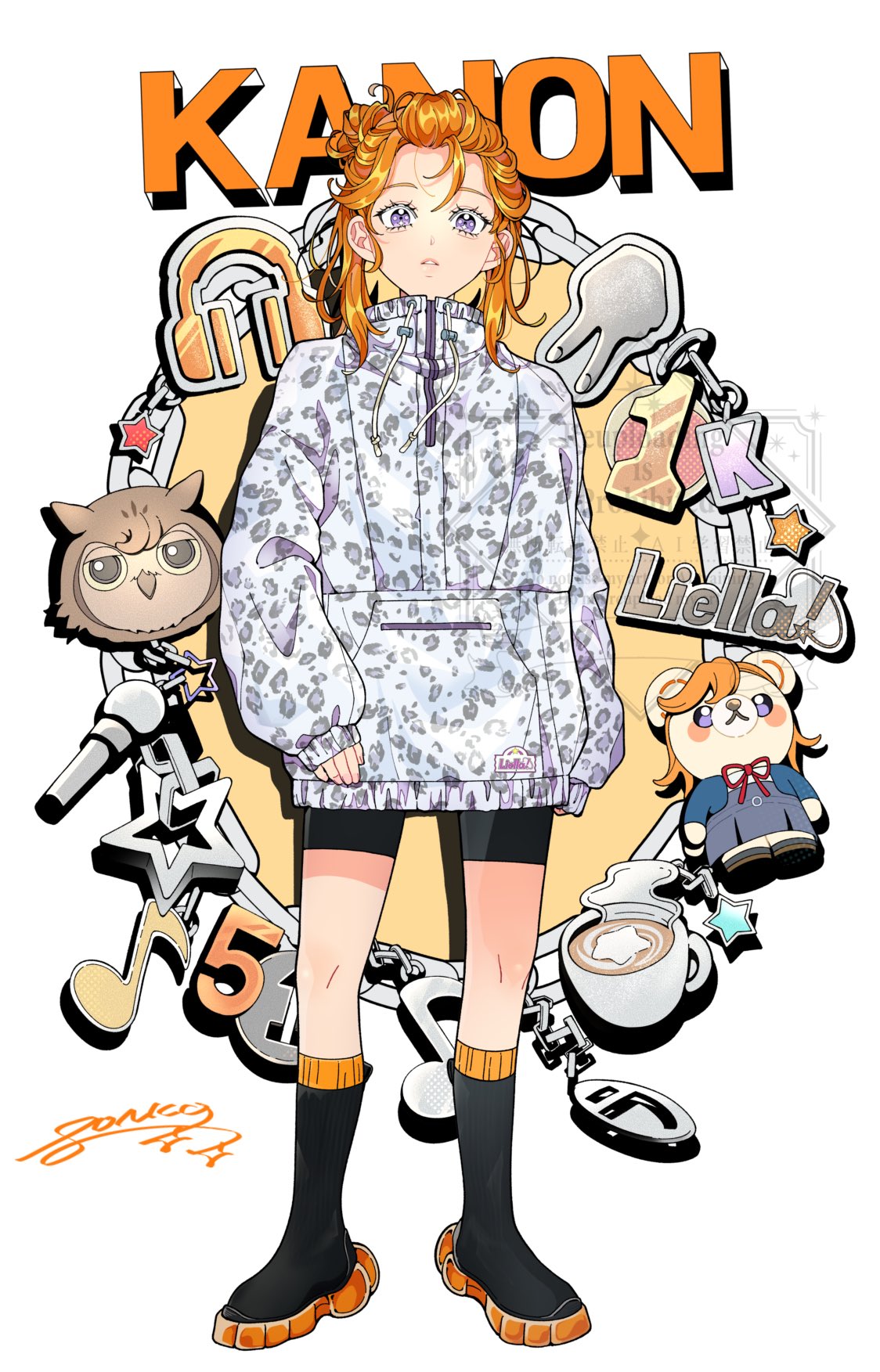 1girl animal_print animalization bangs_pinned_back bike_shorts black_boots black_shorts boots character_charm character_doll character_logo character_name charm_(object) coffee colored_shoe_soles commentary_request cup doll eighth_note full_body group_name highres hood hoodie leopard_print long_hair long_sleeves looking_at_viewer love_live! love_live!_superstar!! manmaru_(love_live!) microphone musical_note official_art orange_hair parted_lips ponko517 print_hoodie purple_eyes shibuya_kanon shorts signature sleeves_past_wrists solo standing stuffed_animal stuffed_toy teacup teddy_bear watermark white_hoodie