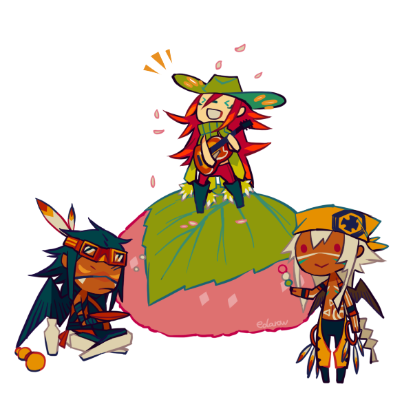 3boys alcohol bird_boy bird_wings blonde_hair blue_hair bottle chaps chibi cowboy cowboy_hat cowboy_western cup dango dark-skinned_male dark_skin drunk edarow feather_hair food full_body goggles goggles_on_head gourd green_scarf guitar hat holding holding_instrument instrument long_hair male_focus mini_person miniboy mochi multiple_boys music original playing_guitar playing_instrument red_hair sakazuki sake sake_bottle sakura_mochi sanshoku_dango scarf simple_background squeans striped_clothes vertical-striped_clothes very_long_hair wagashi western white_background wings