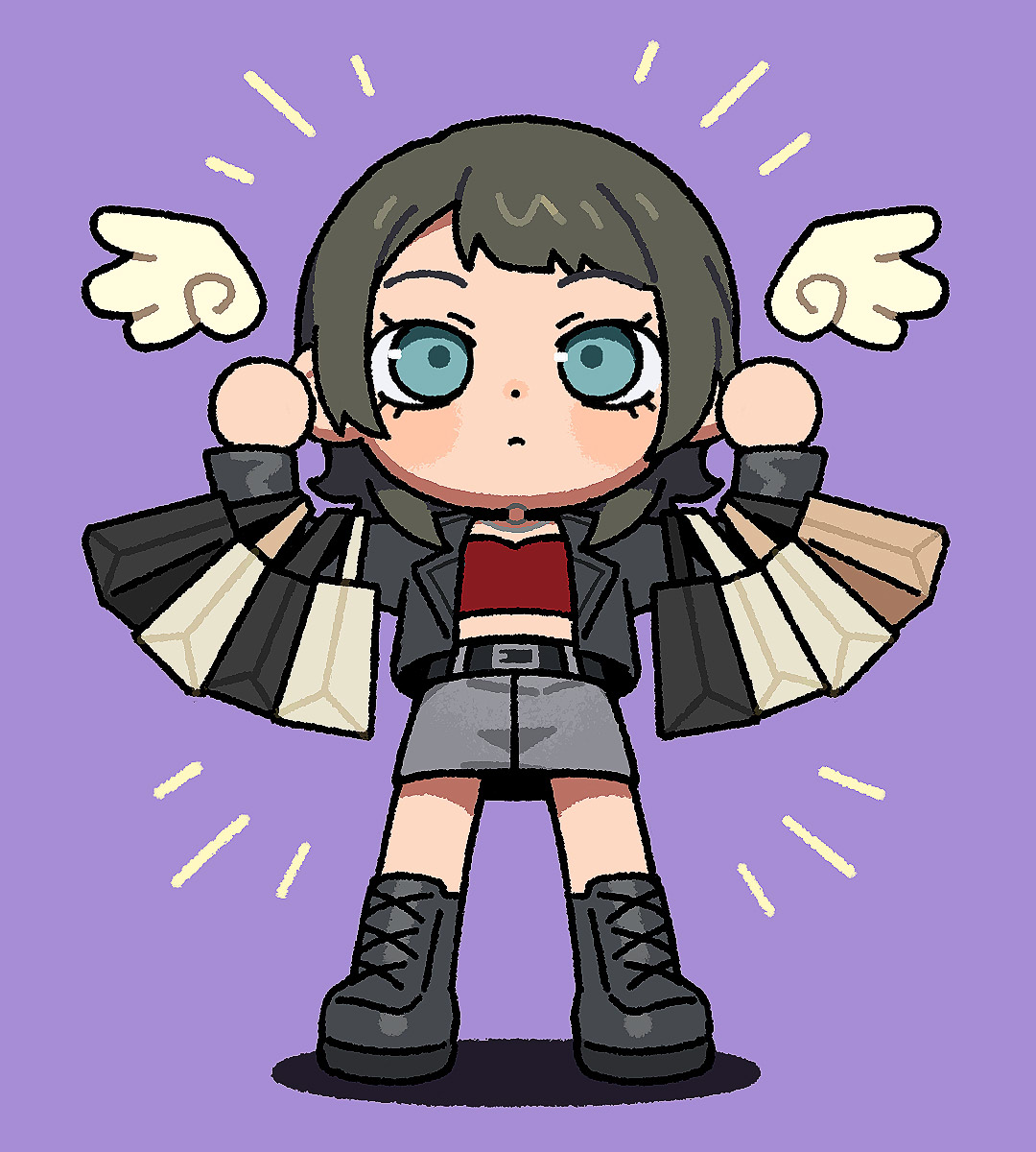 1girl bag bang_dream! bang_dream!_it's_mygo!!!!! black_boots black_hair blue_eyes blush boots closed_mouth commentary grey_skirt highres jacket medium_hair open_clothes open_jacket purple_background red_shirt shao_(shaorouhong) shirt shopping_bag simple_background skirt solo standing untranslatable_commentary yahata_umiri