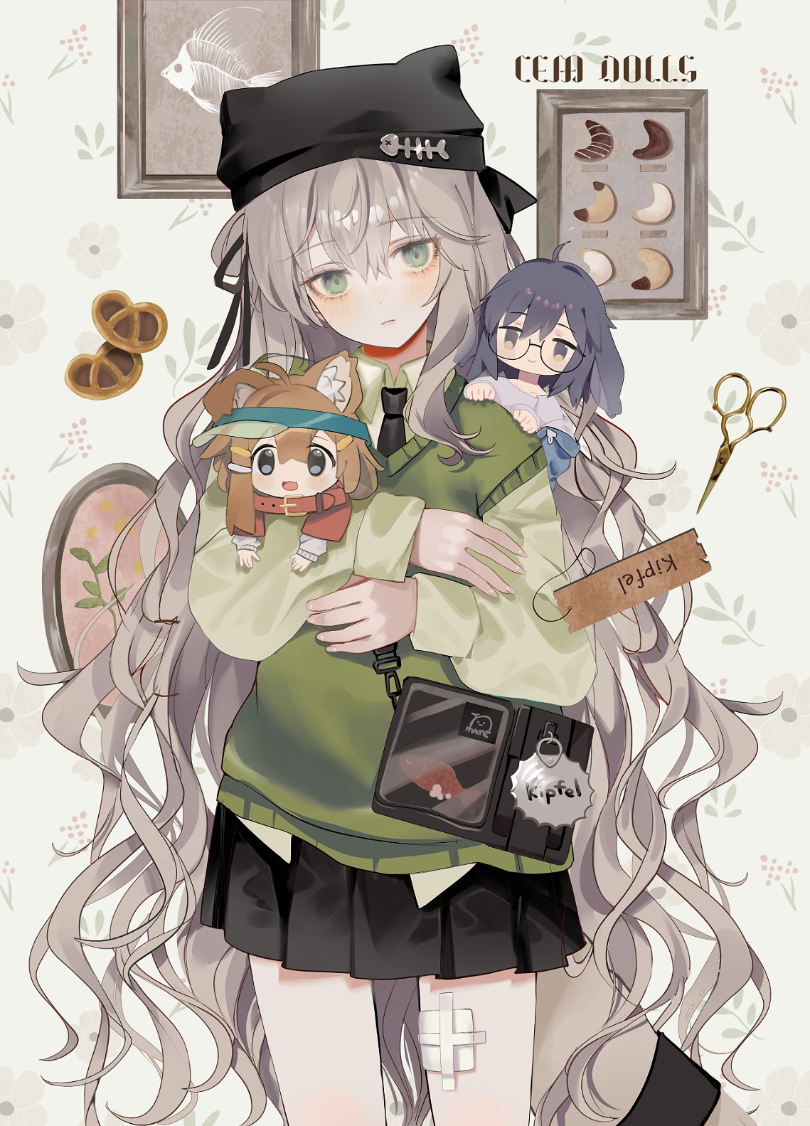 3girls :d ahoge animal_ears animal_hat bag bandaged_leg bandages bandaid bandaid_on_knee bandaid_on_leg beanie black_bag black_necktie black_ribbon black_skirt blue_eyes blue_hair blush brown_hair carrying cat_ears cat_girl cat_tail character_doll charm_(object) chibi chibi_inset chiemo_(xcem) closed_mouth collar collared_shirt cookie cowboy_shot doll double-parted_bangs drawing_(object) expressionless food glasses green_eyes green_shirt green_sweater green_vest grey_hair hair_between_eyes hair_ornament hair_ribbon hairclip hat highres holding kipfel_(vrchat) long_hair long_sleeves looking_at_viewer mamehinata mini_person minigirl miniskirt multiple_girls necktie open_mouth parted_lips picture_frame pleated_skirt rabbit_ears ribbon round_eyewear school_uniform scissors shirt shoulder_bag skirt smile standing sweater sweater_vest tail usasaki_(vrchat) very_long_hair vest vrchat wavy_hair white_shirt