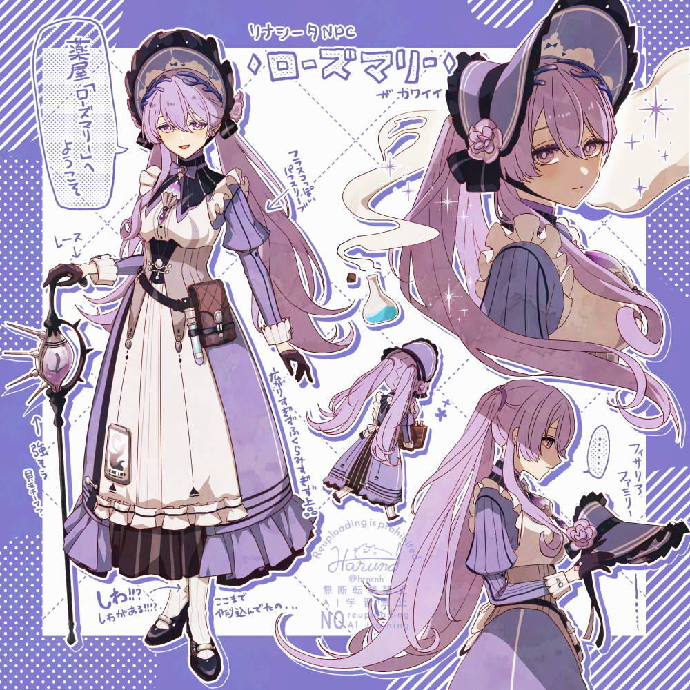 1girl black_collar black_gloves bonnet breasts closed_mouth collar commentary dress gloves haruna_(hrnrnh) holding long_hair long_sleeves looking_at_viewer medium_breasts multiple_views purple_bonnet purple_dress purple_eyes purple_hair rosemary_(wuthering_waves) smile socks twintails white_socks wuthering_waves