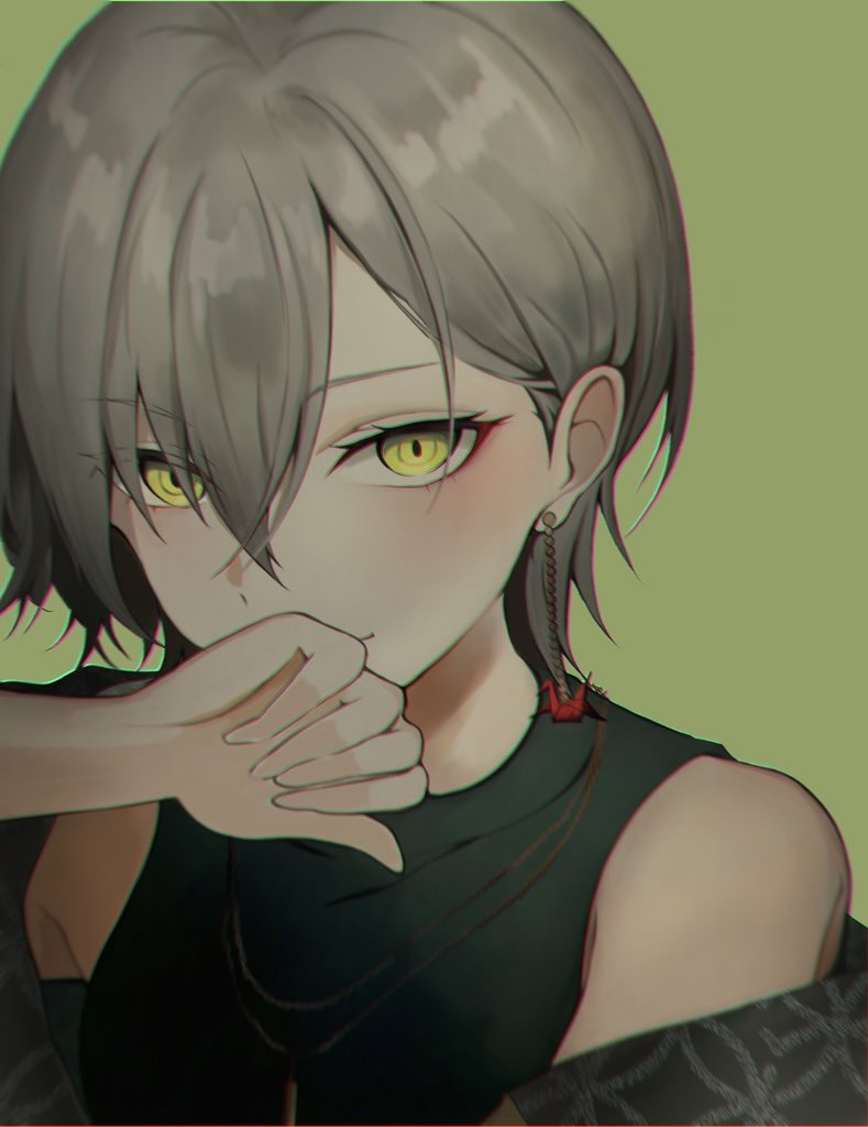1girl arm_up armpit_crease bare_shoulders black_shirt closed_mouth commentary_request covering_own_mouth crossed_bangs earrings green_background green_eyes grey_hair hair_behind_ear hair_between_eyes hinomori_shiho jakko_chan jewelry kawaranu_atatakasa_no_tonari_de_(project_sekai) necklace off_shoulder official_alternate_costume official_alternate_hairstyle origami paper_crane pendant portrait project_sekai shirt short_hair single_earring single_sidelock sleeveless sleeveless_shirt solo