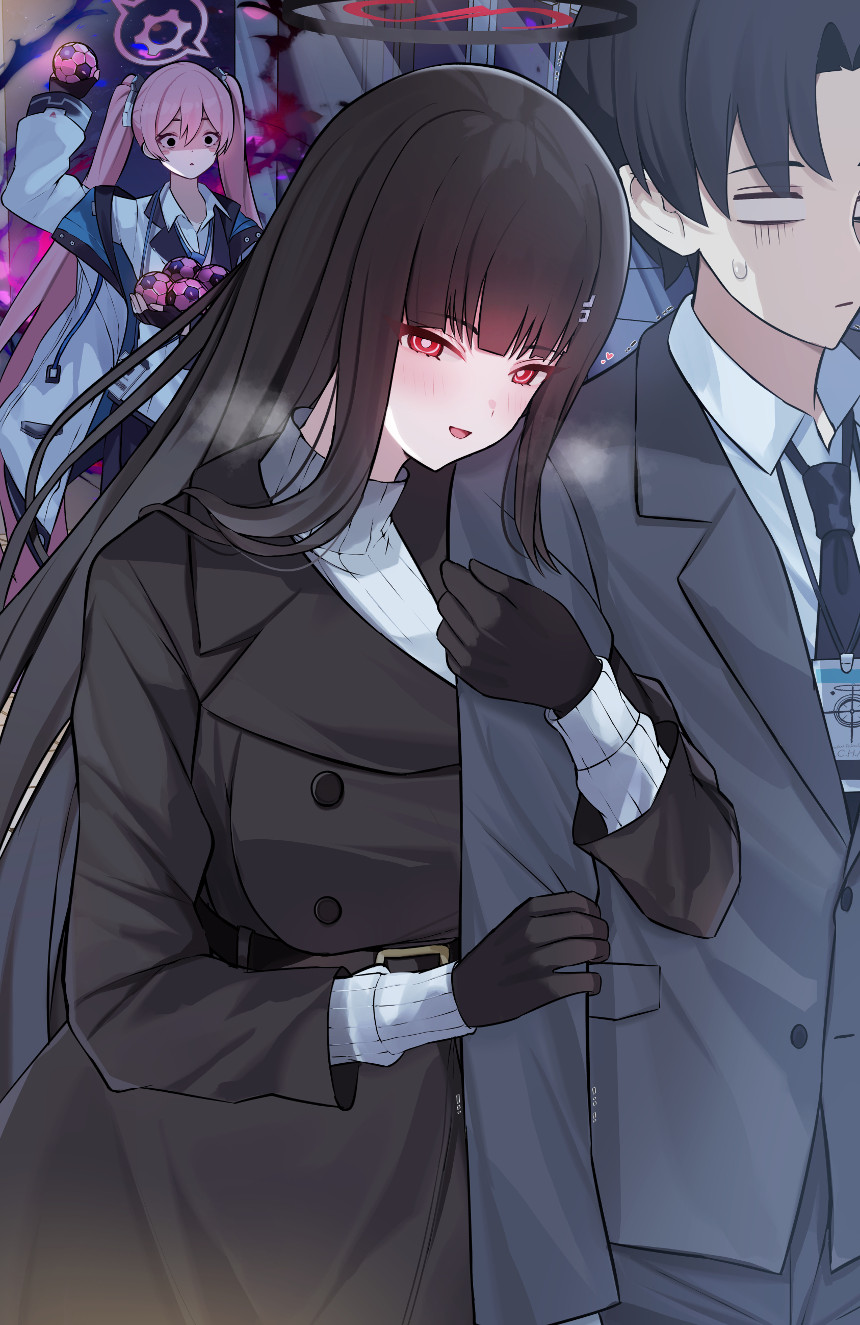 1boy 2girls absurdres arm_hug aura black_coat black_hair blue_archive blunt_bangs blush bomb coat cowboy_shot dark_aura explosive formal_clothes grey_suit halo highres holding holding_bomb id_card jealous koyuki_(blue_archive) mi_taro333 multiple_girls necktie pink_hair rio_(blue_archive) rio_(winter)_(blue_archive) sensei_(blue_archive) sensei_(blue_archive_the_animation) shaded_face smile solo_focus suit sweater twintails white_sweater