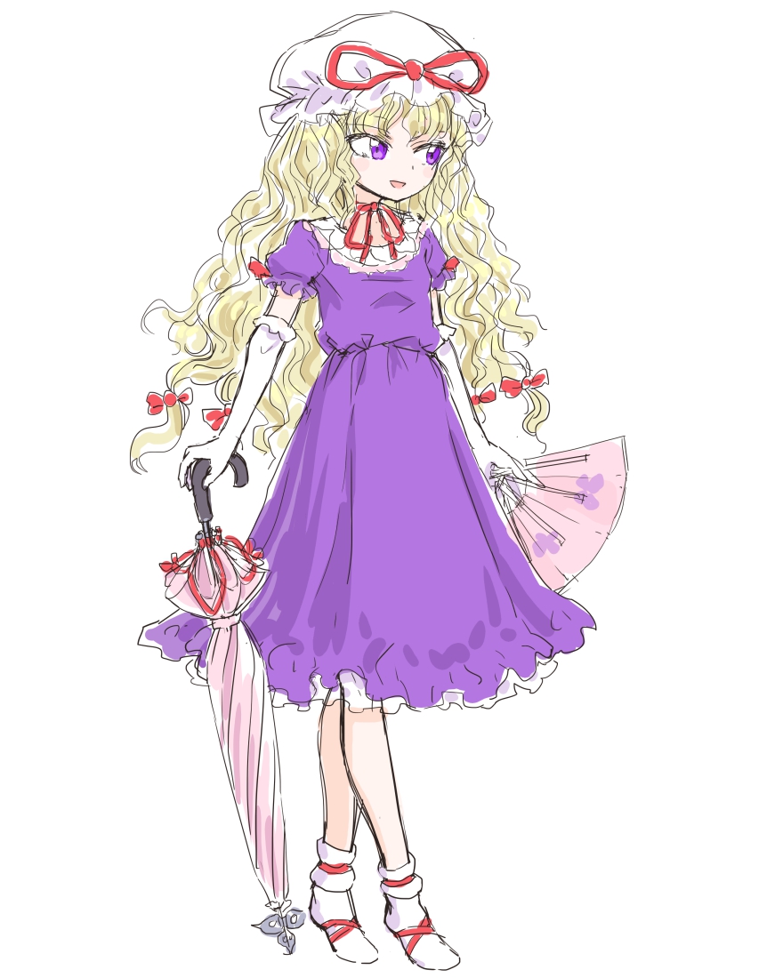 1girl blonde_hair choker dress elbow_gloves frills gloves hair_ribbon hand_fan hat holding holding_fan holding_umbrella long_hair mob_cap open_mouth perfect_cherry_blossom purple_dress purple_eyes ribbon ribbon_choker s-a-murai short_sleeves smile solo touhou umbrella wavy_hair white_background yakumo_yukari yakumo_yukari_(young)