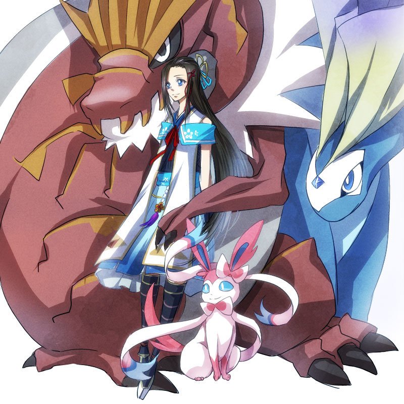 armor armored_boots aurorus black_hair blue_eyes boots gen_6_pokemon hair_ribbon lady_hayakawa_(sengoku_musou) japanese_clothes long_hair nintendo parted_bangs pokemon pokemon_conquest ribbon sengoku_musou smile sylveon tyrantrum white_background