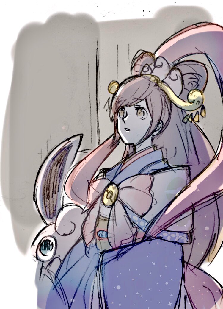 brown_eyes brown_hair gen_1_pokemon hair_bun hair_ornament japanese_clothes kimono long_bangs long_hair long_sleeves looking_up nintendo obi oichi_(pokemon_conquest) poke_ball_print pokemon pokemon_conquest ponytail sash satiko0222 sengoku_musou swept_bangs wigglytuff