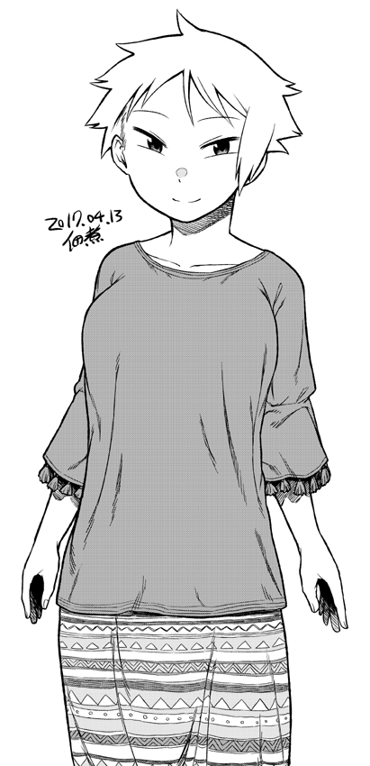 1girl arms_at_sides breasts collarbone cowboy_shot dated large_breasts long_sleeves looking_at_viewer monochrome original shirt short_hair signature simple_background smile solo standing straight-on tsukudani_(coke-buta) tsurime-chan white_background