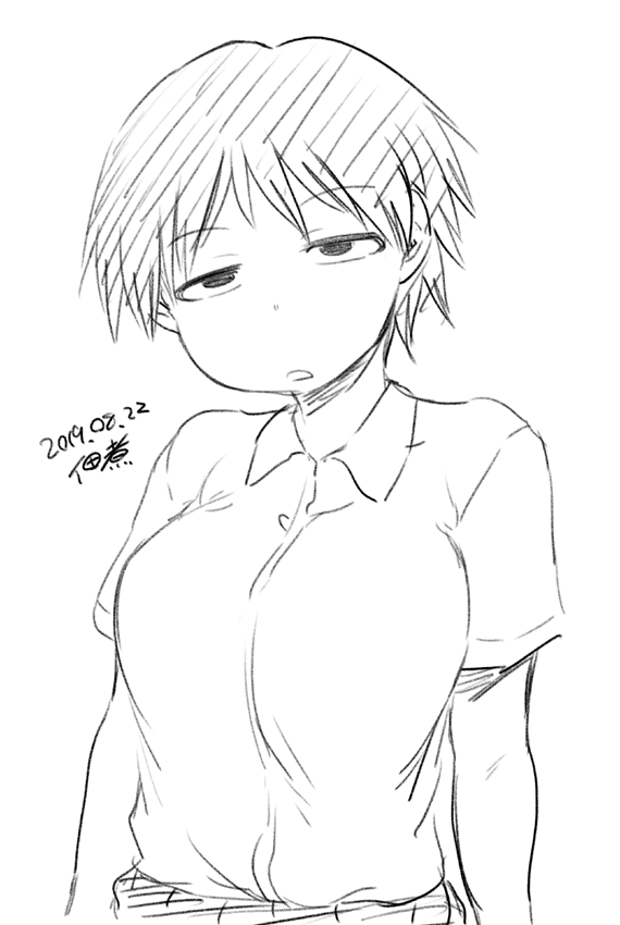 1girl arms_at_sides black_eyes breasts collared_shirt dated greyscale large_breasts looking_at_viewer monochrome open_mouth original shirt short_hair short_sleeves signature simple_background tsukudani_(coke-buta) upper_body white_background
