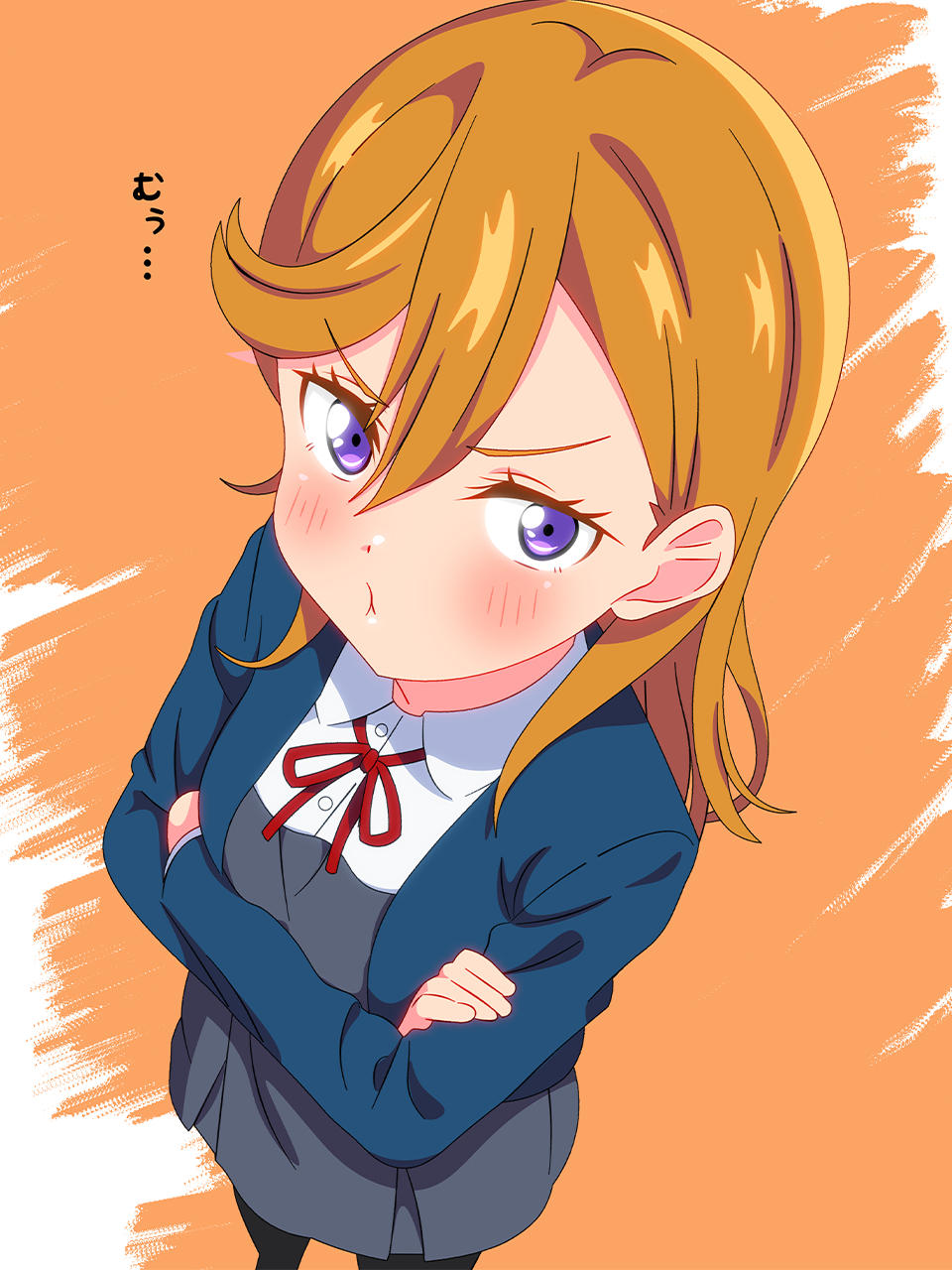 1girl :t blue_jacket blush collared_shirt commentary crossed_arms dress dress_shirt feet_out_of_frame grey_dress highres jacket jealous long_hair long_sleeves looking_at_viewer love_live! love_live!_superstar!! neck_ribbon open_clothes open_jacket orange_background orange_hair pinafore_dress pout purple_eyes red_ribbon ribbon school_uniform shibuya_kanon shinonome_sakura shirt short_dress simple_background sleeveless sleeveless_dress solo standing v-shaped_eyebrows white_shirt winter_uniform yuigaoka_school_uniform