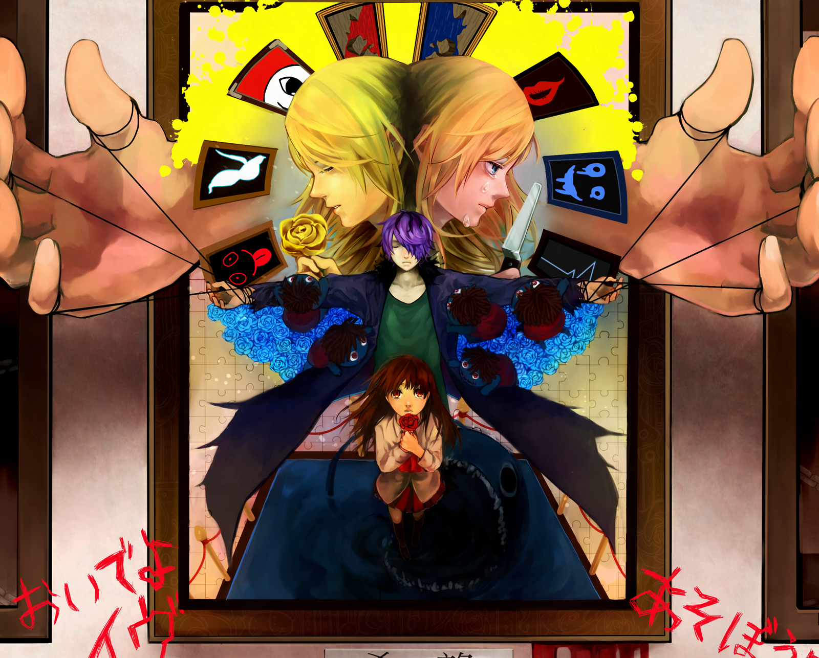 1boy 3girls blue_eyes bound brown_eyes brown_hair closed_eyes commentary_request crying flower garry_(ib) hair_over_one_eye highres holding holding_flower ib_(ib) ib_(kouri) ichita_kuuto mary_(ib) multiple_girls outstretched_arms purple_hair red_flower red_rose rose string symmetry tears translation_request yellow_flower yellow_rose