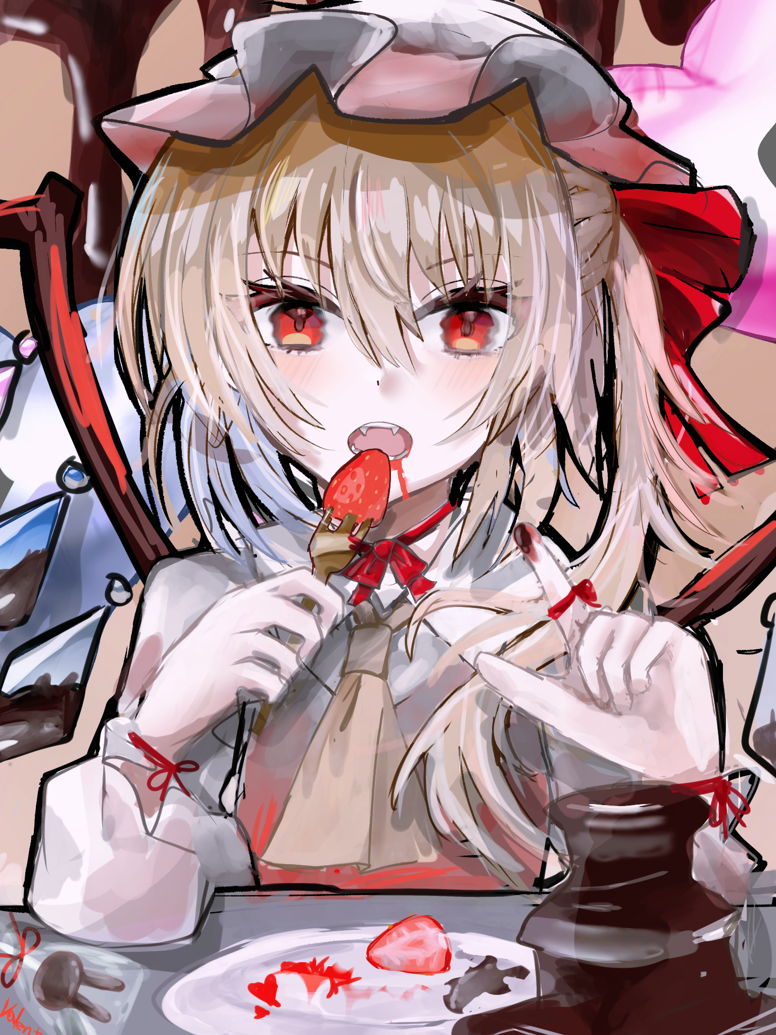 1girl ambiguous_red_liquid aoimise3939 ascot blonde_hair bow chocolate chocolate_on_hand choker collared_shirt commentary_request crystal crystal_wings dripping eating fangs flandre_scarlet food food_on_hand fork fruit hair_bow hat heart highres holding holding_fork index_finger_raised light_blush long_sleeves looking_at_viewer mixed-language_commentary one_side_up open_mouth plate puffy_long_sleeves puffy_sleeves red_bow red_eyes red_ribbon red_vest ribbon ribbon_choker shirt solo strawberry strawberry_slice table touhou valentine vest white_hat white_shirt wings wrist_ribbon yellow_ascot