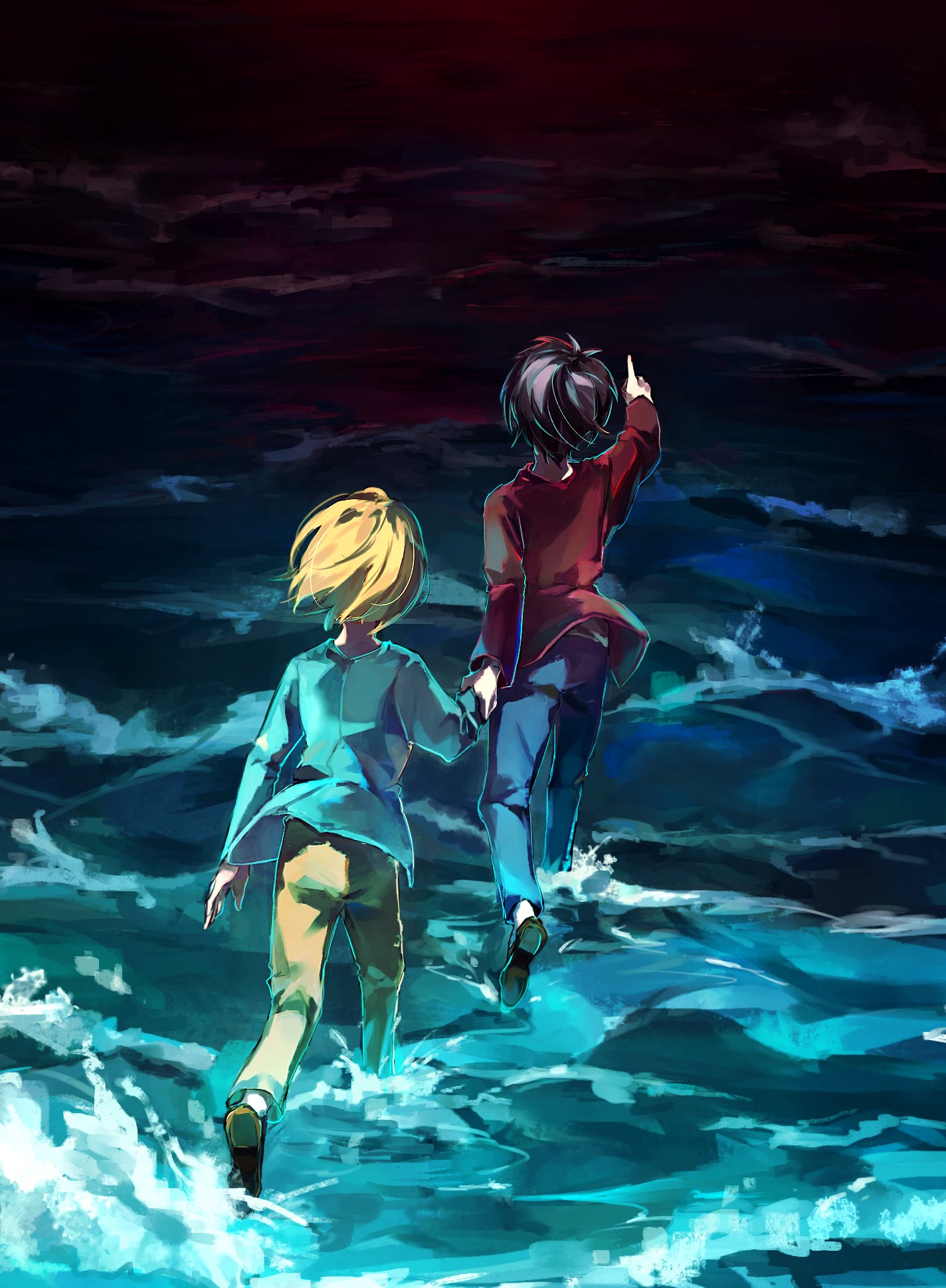 2boys armin_arlert blonde_hair blue_shirt brown_hair child eren_yeager facing_away full_body grey_background highres holding_hands long_sleeves male_focus moruru_08 multiple_boys ocean pointing red_shirt shingeki_no_kyojin shirt short_hair soaking_feet