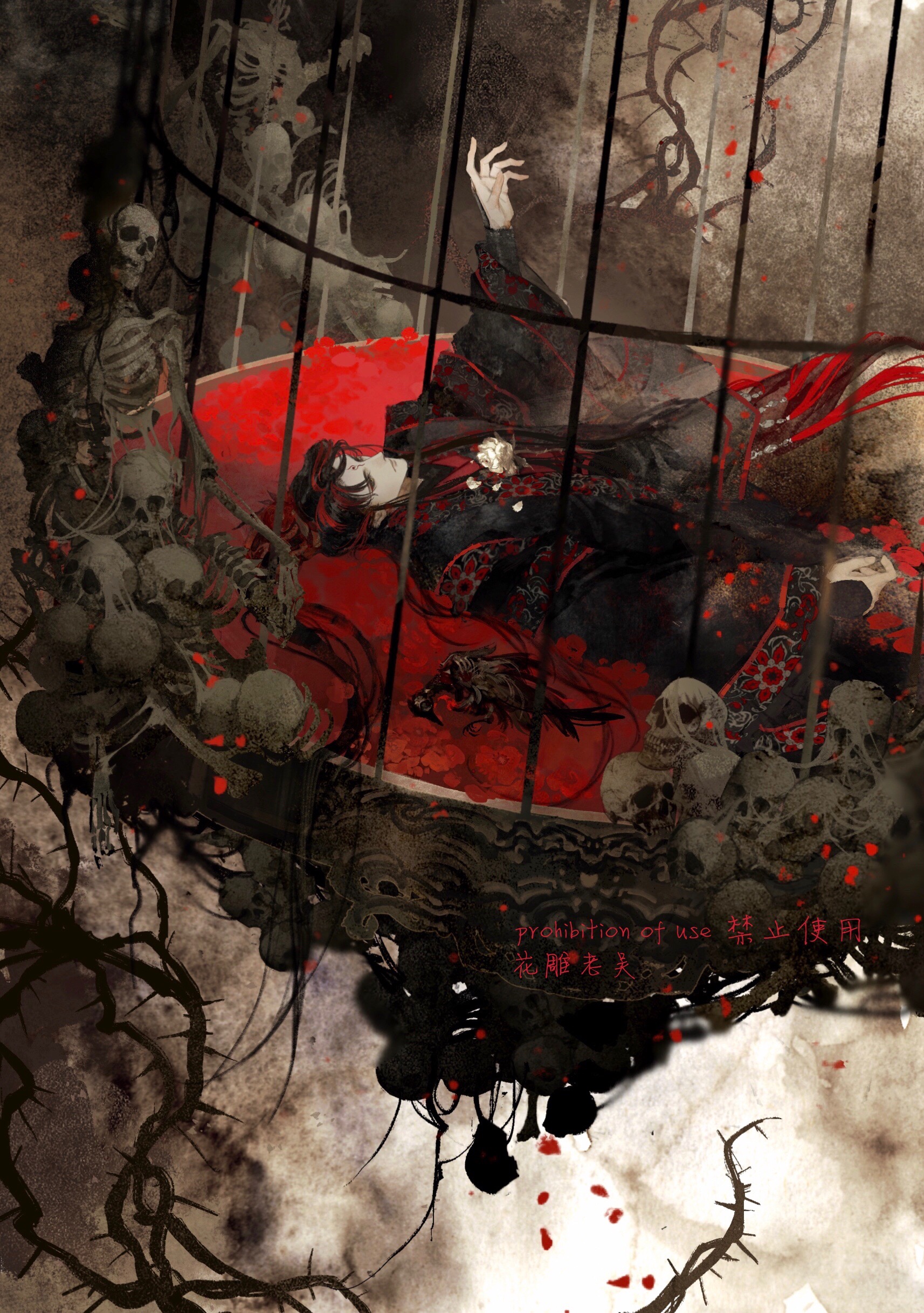 1boy absurdres animal_skeleton arm_up black_hair black_hanfu black_sleeves cage chinese_clothes closed_mouth dust facial_mark falling_petals floral_print flower hanfu highres huadian in_cage jinguang_budaixi long_sidelocks long_sleeves looking_up lying male_focus multicolored_hair on_back parted_hair patterned_clothing petals red_flower red_hair red_petals shangguan_hongxin sidelighting sidelocks skeleton sleeves_past_wrists solo thorns upper_body watermark white_flower white_petals wide_sleeves xiao_guan_(headdress) yu_yu_huadiao