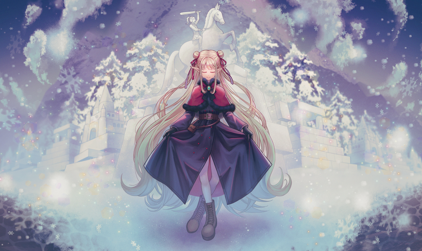 1girl blonde_hair boots closed_eyes crossed_legs double_bun elf facing_viewer full_body hair_bun mountain original pine_tree pointy_ears snow snowing solo standing statue tree tubering winter