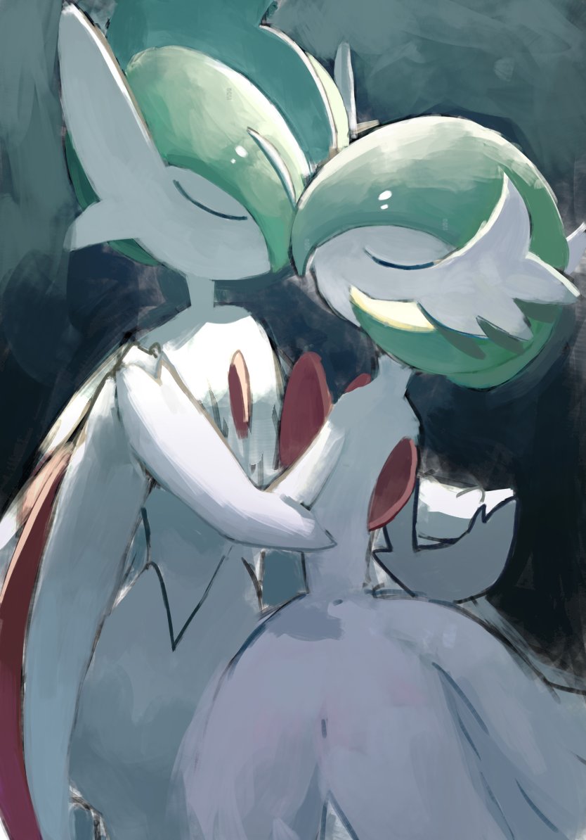 closed_eyes colored_skin dress elbow_gloves gallade gardevoir gen_3_pokemon gen_4_pokemon gloves holding_hands kuki_3433 mega_gallade mega_gardevoir mega_pokemon nintendo pokemon pokemon_(creature) white_dress white_gloves white_skin