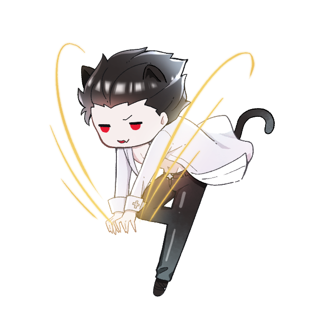 1boy :3 animal_ears attack belt black_hair black_pants black_shoes brown_belt cat_boy cat_ears cat_tail chibi chibi_only claws collared_shirt floating_clothes grin hair_slicked_back michael_roa_valdamjong open_clothes open_shirt pants pectorals red_eyes shirt shoes simple_background sleeve_cuffs smile tail tsukihime tsukihime_(remake) vampire white_background white_shirt yukinari_kakuri