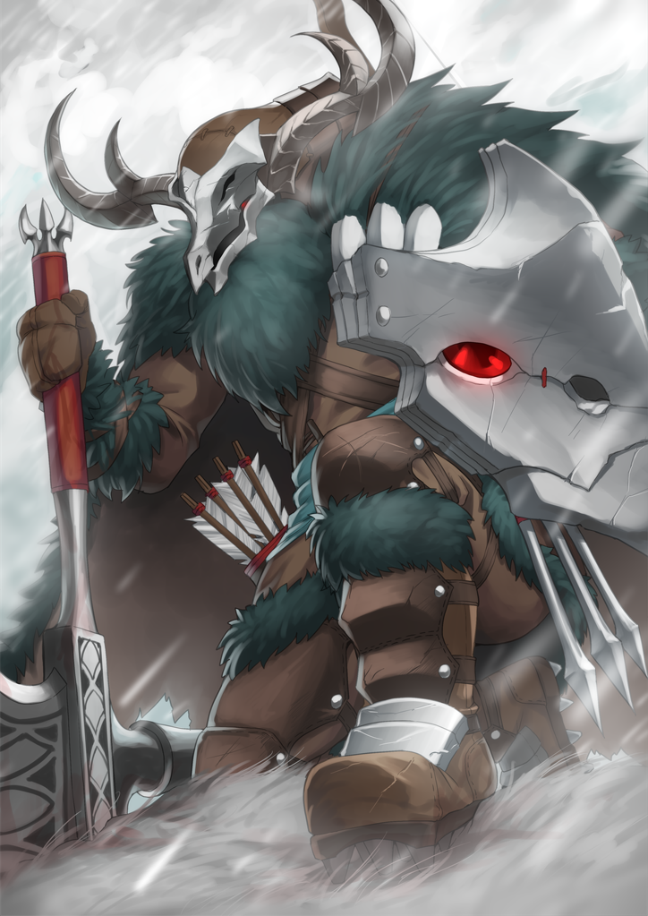 armor axe boots brown_boots brown_mittens coat fur_coat giant helmet holding holding_axe horns kneeling mittens outdoors pixiv_fantasia pixiv_fantasia_revenge_of_the_darkness red_eyes sasebono_mari snowing spiked_boots