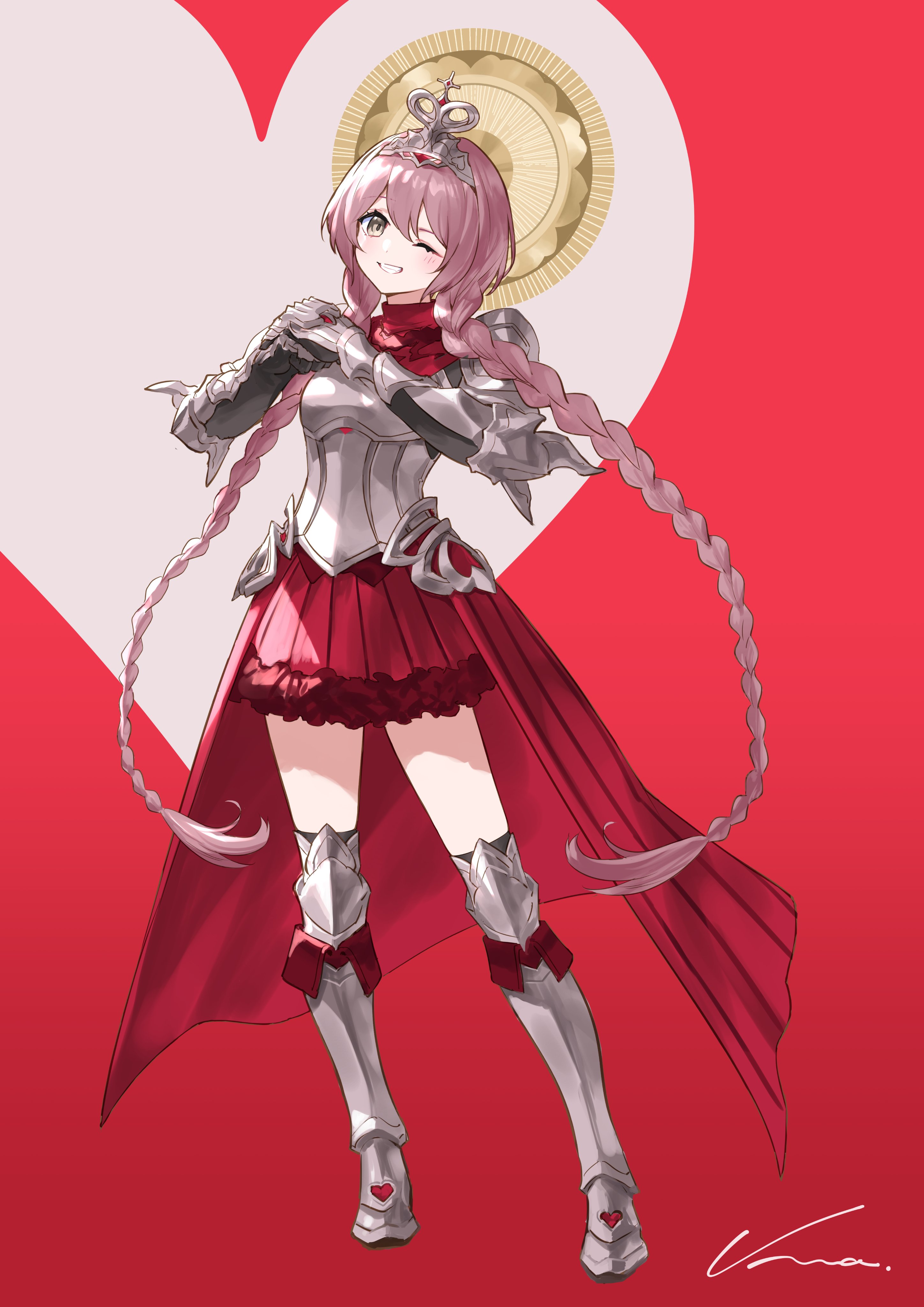 1girl absurdres alternate_costume amayui_moka armor armored_boots boots braid breastplate double-parted_bangs fold-over_boots full_body fur-trimmed_skirt fur_trim gauntlets greaves grey_eyes grin hair_between_eyes heart highres light_blush low_twin_braids nemoto_yuuma one_eye_closed overskirt own_hands_together pink_hair plate_armor pleated_skirt red_background red_overskirt red_skirt skirt smile solo standing tiara turtleneck twin_braids virtual_youtuber vspo!