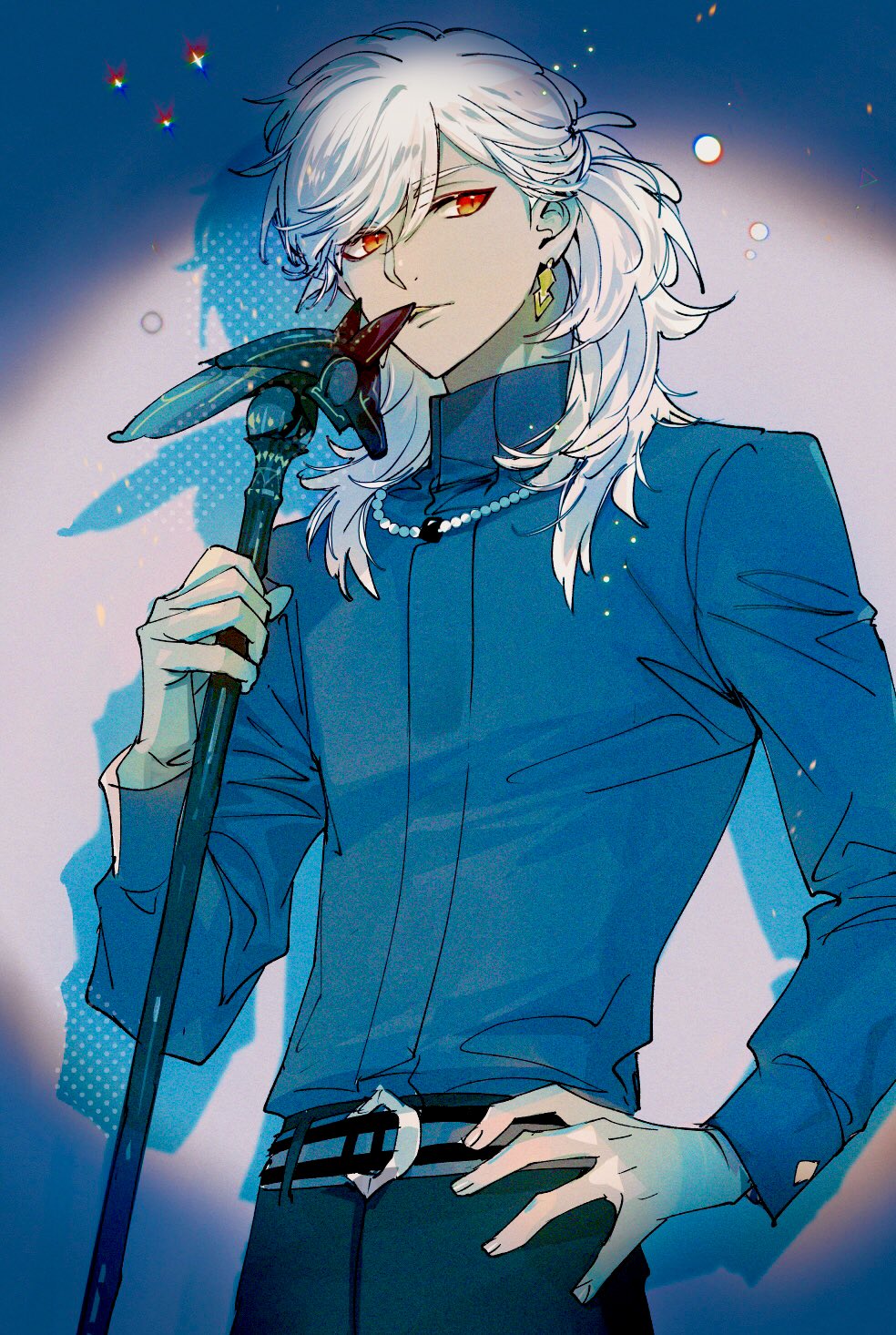 1boy abyssosque12 bead_necklace beads belt black_belt black_pants cane commentary_request cyno_(genshin_impact) cyno_(resplendent_feast)_(genshin_impact) drop_shadow earrings genshin_impact gold_earrings grey_hair hair_between_eyes hair_over_one_eye hand_on_own_hip highres holding holding_cane jewelry licking long_sleeves looking_at_another male_focus medium_hair necklace orange_eyes pants ponytail shirt solo spotlight tan tassel turtleneck turtleneck_shirt